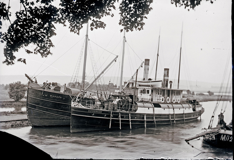 Förstorade bilden t.h. och tycker mej se att det står WARGÖ 1 i fören. Skulle i så fall kunna vara 2644 WARGÖ I byggd i Motala 1873, blev pråm 1959 och skrotad 1977. Enl sv. skeppslista.