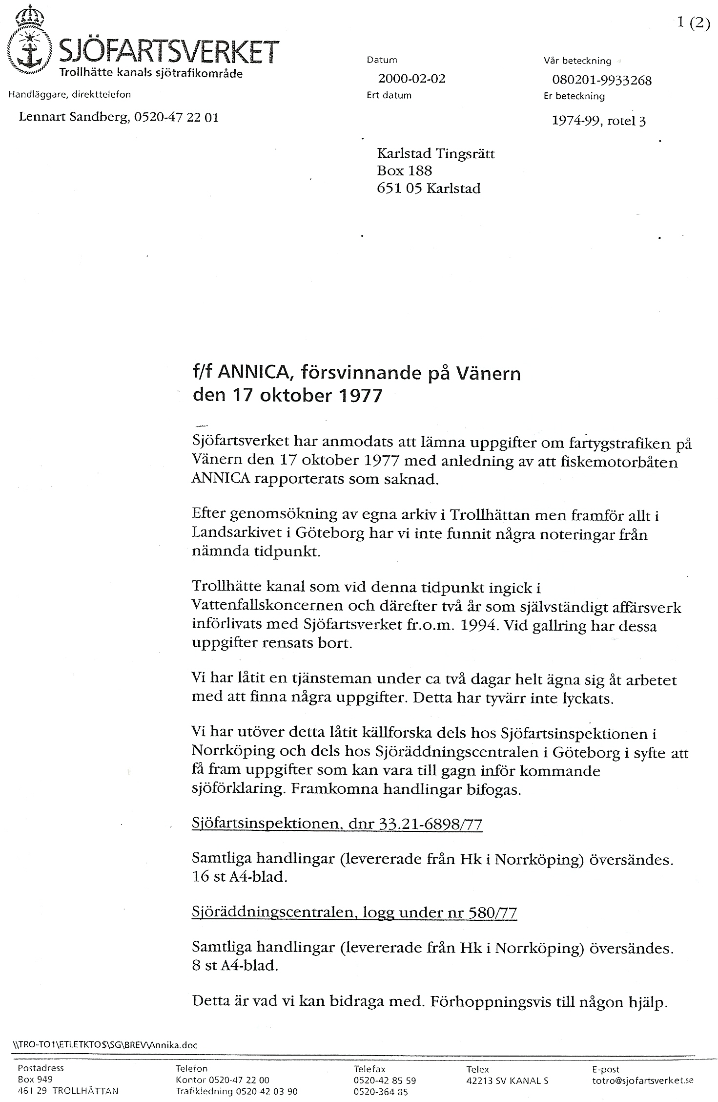 Re: Vem/vad sänkte Fiskebåten ANNICA på Vänern 17/10 1977 ?