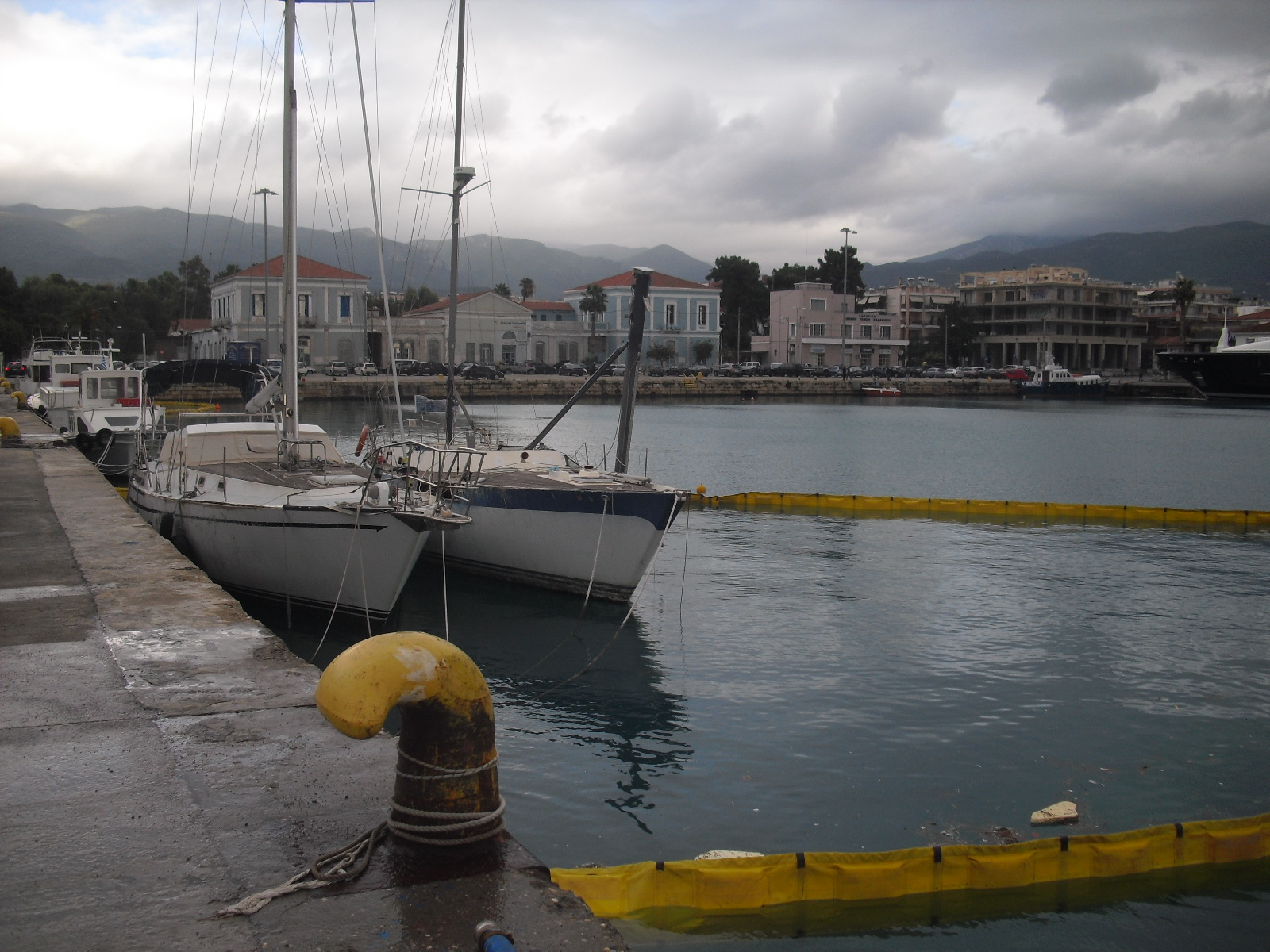Jag var i hamnen idag och såg förödelsen efter den senaste stormen. Det blåste 8-9 beaufort rätt in i hamnen där omhändertagna smuggelbåtar ligger i avvaktan på auktion. Två seglare, den ena utanpå den andra, låg och högg mot kajen och varandra så att de fick stora skador. Bl. a bröts stormasten på den utanpåliggande ketchen. Bordläggningen bröts upp på flera ställen. När jag kom dit idag hade man lagt ut länsor runt de båda och en tankbil hade just sugit upp olja. Vid samtal med chauffören framgick att det inte var några stora mängder han sett. De här två båtarna har beslagtagits i samband med att de stoppats vid narkotikasmuggling strax söder om Peloponnesos för några år sedan. Chauffören sa fem år och jag gissar att det är däromkring. Han var också irriterad för att det tar så lång tid att få till stånd en auktion. Nu ligger de fortfarande här i hamnen och drar pengar och blir sämre för varje dag som går. De skulle bara behöva ligga några månader tyckte chauffören och jag håller med. Men det är rättsväsendets kvarnar som mal så långsamt misstänker jag och det är många som skall sätta stämplar på många olika papper innan det blir klart och rättssäkert. De som hyr ut länsor och bevakar förtöjningar är säkert glada för säkra inkomster garanterade av staten.