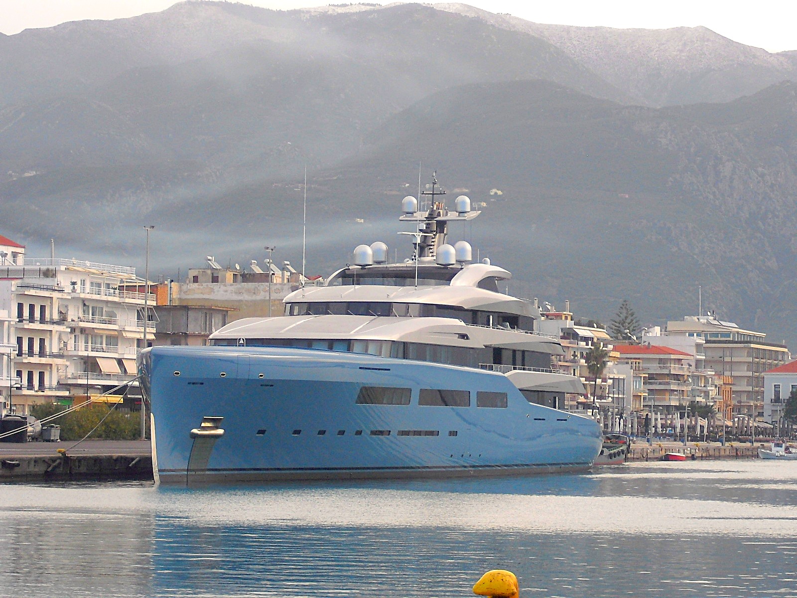 Här kommer en bild på Aviva 1012957 liggande i hamnen. Hon tillhör en av de rikaste i England och skall vara nr 46 i storlek i världen i sitt slag. Hon är omkring 100 meter lång. Bland leksakerna ombord finns en tennisplan, 20 meter lång och 6 meter till taket. Troligen där uppe. Om ni tittar noggrant så kan ni se att snön ligger högst uppe på berget, drygt 1000 meter över Aviva i hamnen. Vi hade när jag tog kortet, idag, 17 grader. Men varför ligger hon här sedan den 7 februari.
