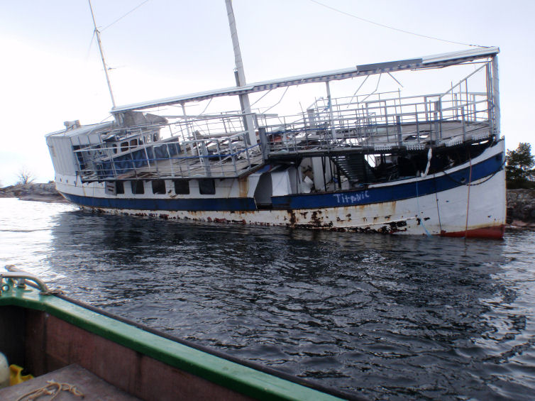 Tog en båttur förbi Aila idag för att kolla hur vintern hade påverkat vraket. Nästan ingenting, hon står likadant som i höstas. Det enda man kan se är att isen lyckats skrapa bort lite färg på utsidan mot sjön. Står stadigt på en berghylla dock vattenfylld. Det måste vara en seglivad gammal dam, det är ju inget skyddad läge precis.