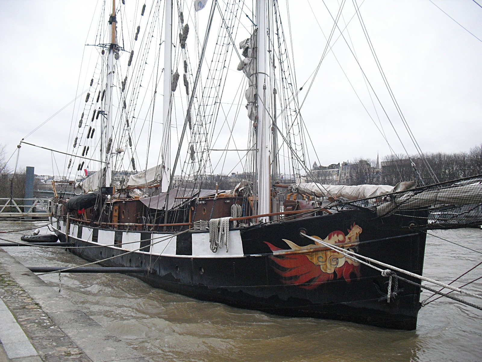 Hittade den här skutan i Paris i förra veckan. Med den riggen kommer hon inte långt. Broarna går inte att öppna. Hon används troligen som bostad. Jag glömde anteckna namnet. Att det är en järnare syns ju men varifrån kommer hon? Holland? Tyskland. Trevligt blickfång. Man har även hängt upp några segel. Någon som känner igen henne?