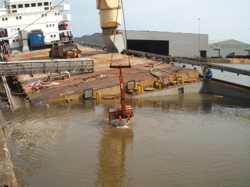 Här kommer några bilder på MV Skagern (Ahlmarks, 6000 tonnare) som nu ligger i Hull efter att ha kört in i en annan båt för två veckor sedan. Hur det kunde hända vet jag inte riktigt. På bilderna lossas lasten (koppar från Boliden) under vatten till en hastighet av ca 3 ton/timme.