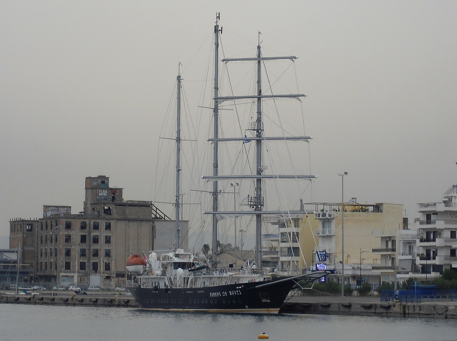 I hamnen ligger just nu detta moderna segelfartyg där alla segel sköts med elektriska motorer. Hon kom igår morse och har det konstiga namnet ”Running on Waves” med Valetta som hemort. Jag tittade lite på prislistan men det var ingen mening med det. Det allra billigaste ett par tusen euro för en vecka och de dyraste på nästan fem tusenlappar. En massa olika saker tillkommer på det priset. Vi har jordvindar från Afrika just nu så de bara ligger och väntar. Allt blir rött och man skall helst inte vistas ute. Hon är 64 meter lång, Imo 9589205. Inte ofta man ser ett modernt segelfartyg med både märs och bram – salning. Den här har det på den fullt råtacklade fockmasten fastän masten ser ut att vara i ett stycke.