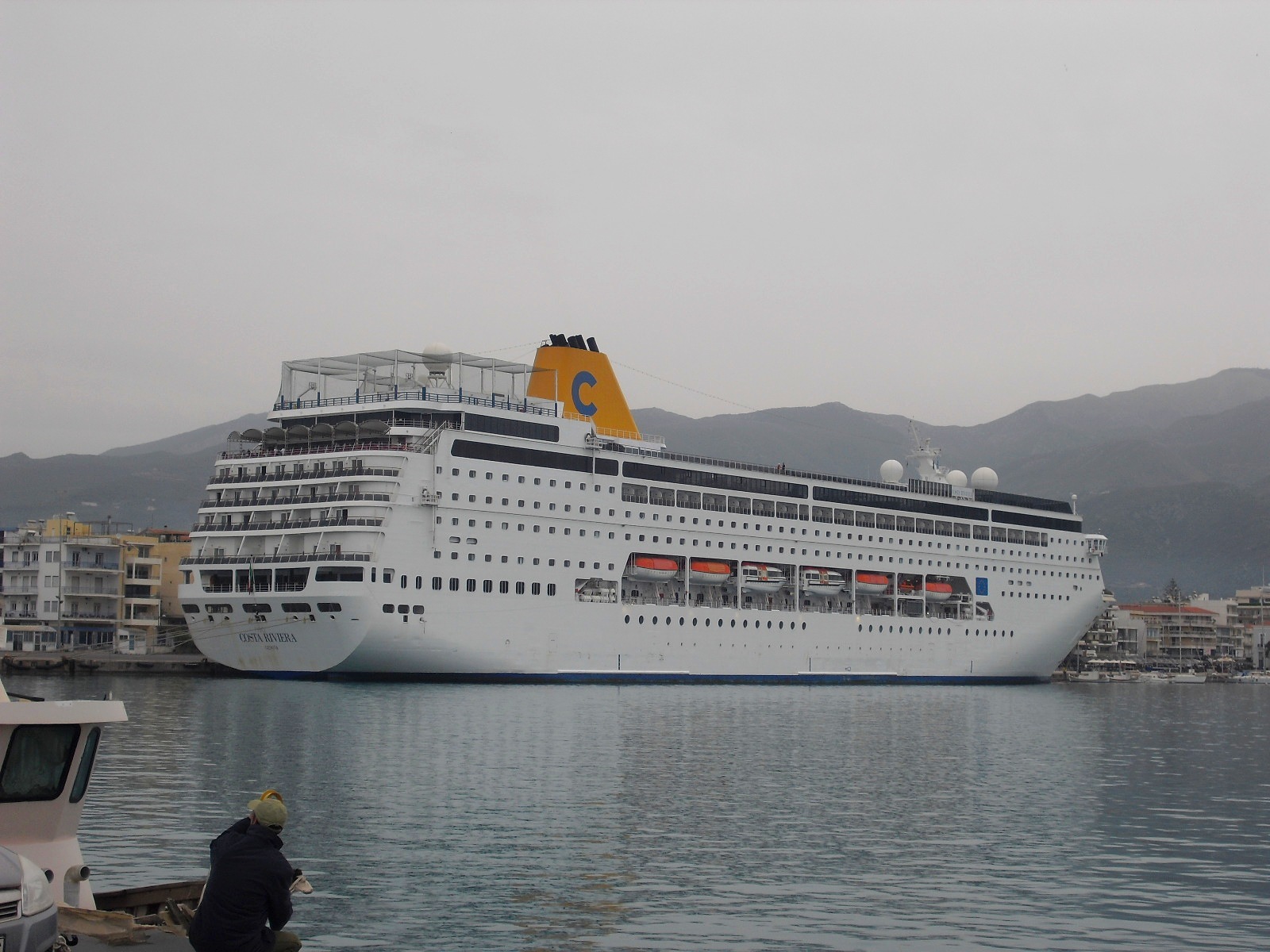 Kryssningsbåten Costa Riviera kom den 25 april och låg över dagen med avgång på kvällen till Heraclio Kreta där turisterna skulle släppas iland dagen därpå. Det stora segelfartyget Running on Waves gav sig iväg strax innan Costa Riviera kom. Hon låg där kryssaren skulle ligga. Running on Waves gick till Kreta. Jag var i hamnen och fick en bild av Costa Riviera som jag skall försöka lägga in. Bilderna på Running on Waves blev mörka på grund av sand i luften från Sahara och bilderna på Costa Riviera blev inte mycket bättre av samma anledning. Nu har sanden försvunnit och vi har klart väder med sol igen och runt 25 grader.