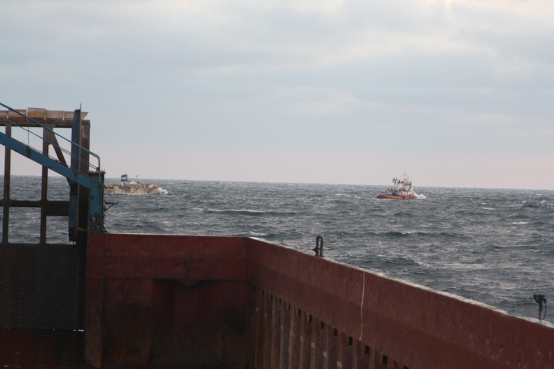KV Barentshav med Skogöy på släp passerade Målöy vid 4-tiden i morse och fortsatte norrut.Men då det utfärdats stormvarning med 20-22 m/s de närmaste dygnen vände de och gick in i Vanylvsfjorden för att avvakta bättre väder.