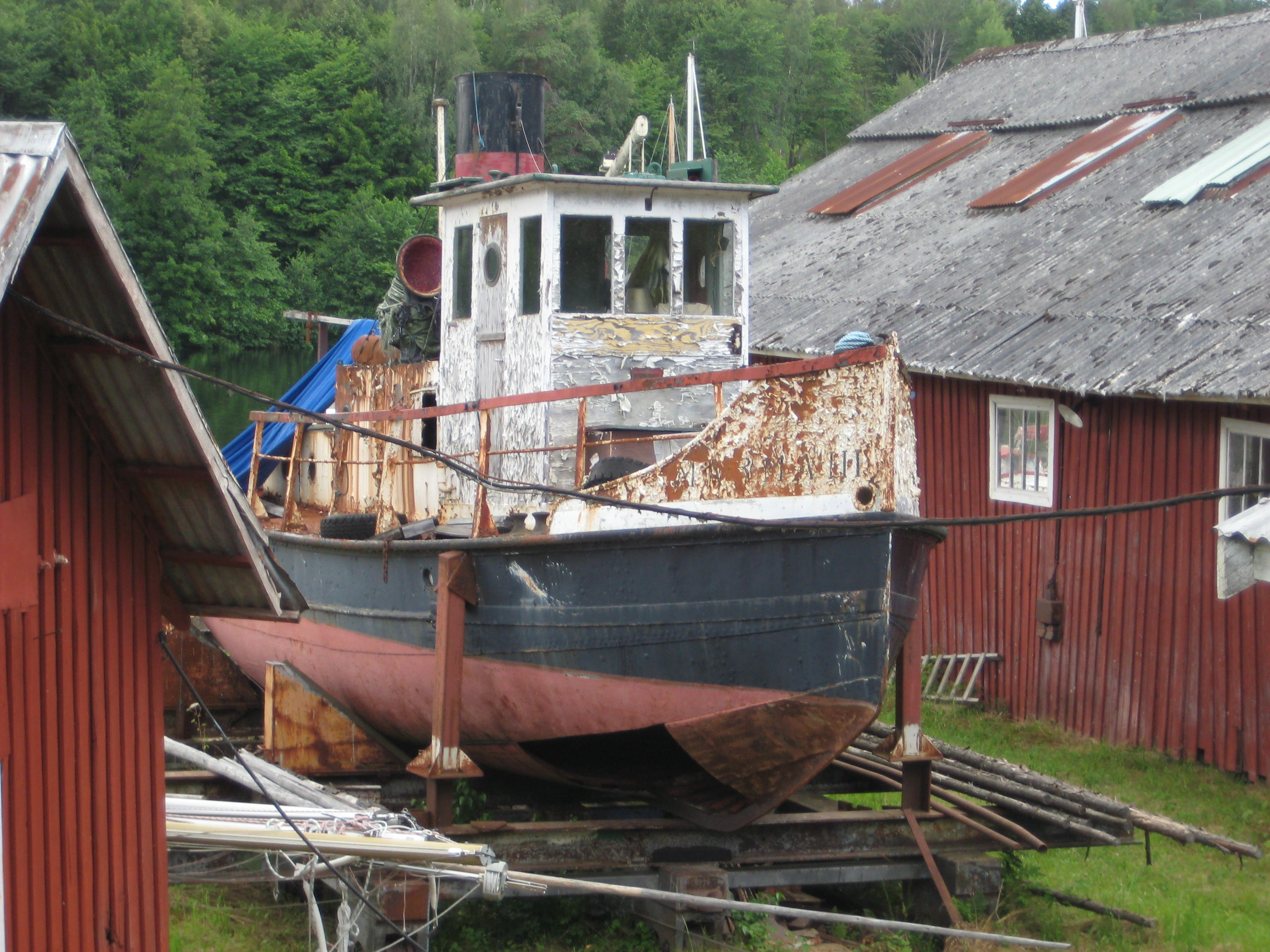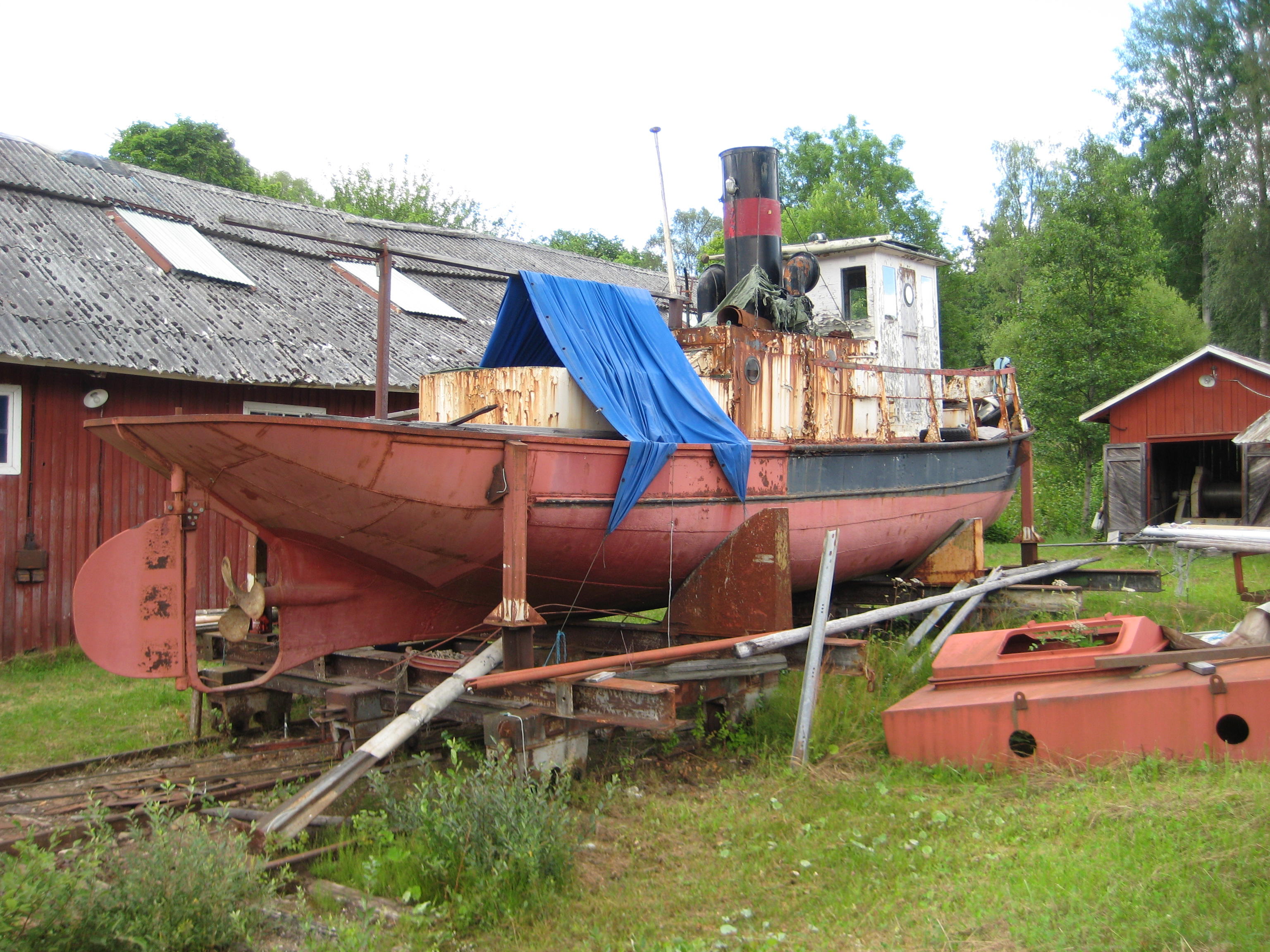 verkar ju som om de ska få den att flyta med länspumpar.. men var ska de skrota den? kan ju alltid förtöja den intill aila.. Gustavsfors är väl närmaste slipen i kanalen? om de inte far till trelle.. eller stänger av länspumpen halvvägs.