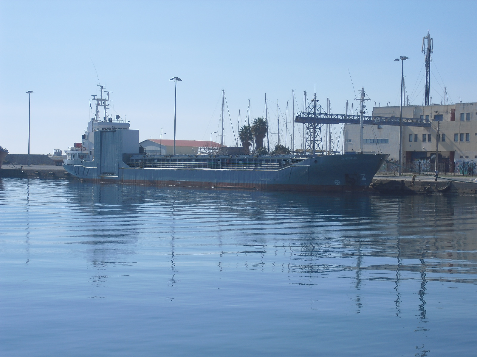 Och här kommer min egen bild från idag på Artefisalle IMO 8509038. Den ligger fortfarande i hamnen med porten utåt hamnen. Hanterar tydligen lasten på annat sätt. Anordningen vid fartygets förskepp som kommer ut från skjulet är en kabelränna för kabelläggarna när de kommer hit och lastar kabel. De kommer ibland men de kom väldigt ofta efter kriget på Balkan för en del år sedan.