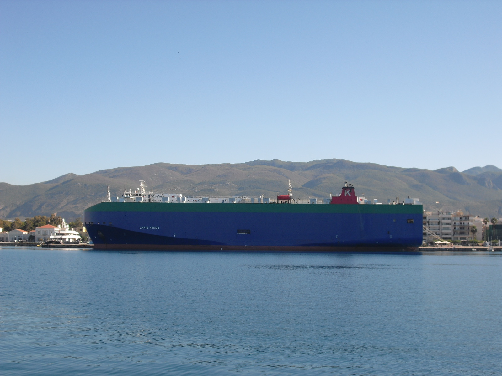 Igår kväll gick bilbåten Lapis Arrow in i hamnen efter att ha legat på redden ett par veckor. Hon var dessförinnan ute och körde ett varv på en halv dag. Precis som de stora kryssningsfartygen gick hon in själv. Den kommentaren behöver man kanske inte göra nu för tiden. Det hör väl till standard när man har vispar i alla hörn. Annat var det på 60-talet när Kungsholm under bogserbåtsstrejk gick in själv och vände i älven och lade till vid Amerikaskjulet.