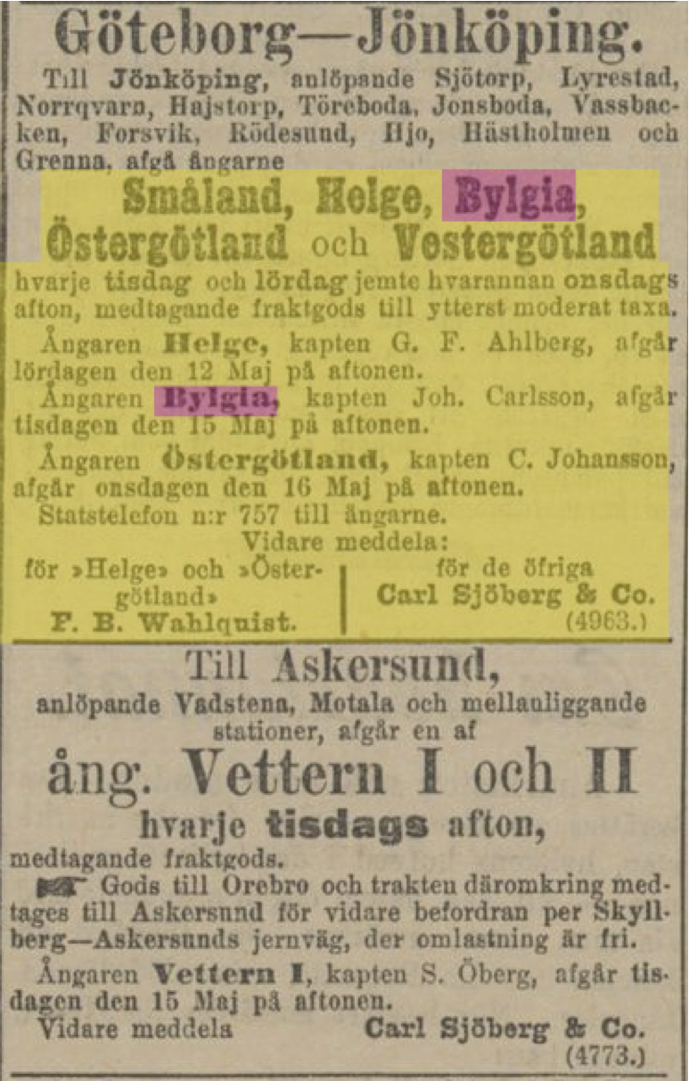 BYLGIA avgick från Göteborg tisdagskvällar (vissa år angavs klockslaget 6 e.m.)