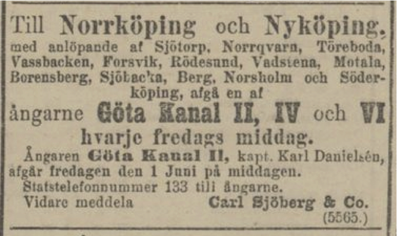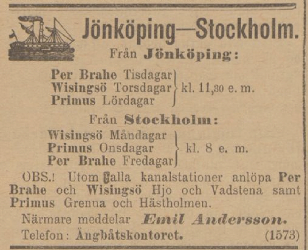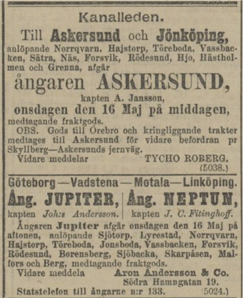Jag får försöka återkomma till detta. Hittills förgäves har jag försökt hitta annonser med avgångar inte bara från Göteborg, utan t ex Askersund, Motala eller Jönköping. Jag vet inte ens om återresorna startade på bestämda veckodagar. Det enda jag kan konstatera är att det borde funnits förutsättningar för det — om man inte låg i natthamn på vägen var en t o r-resa Göteborg - Jönköping väldigt segdragen, om man förutsätter att den varade i tio dagar (5 dagar upp och fem dagar ner, med överliggningar i Göteborg och Jönköping).