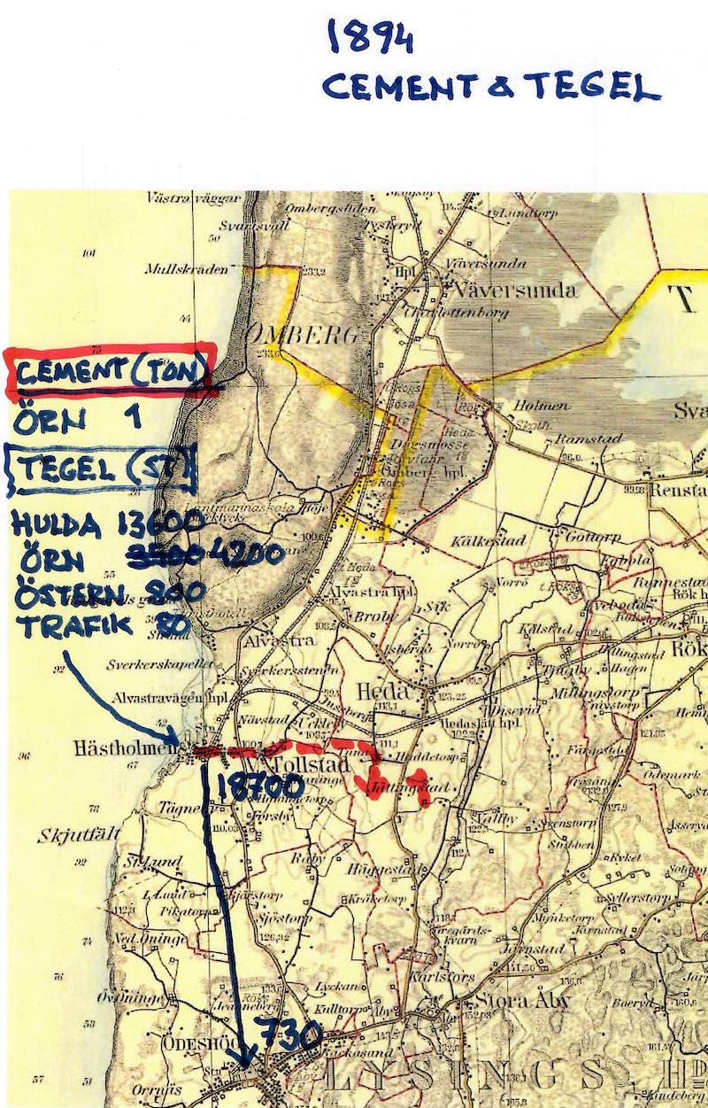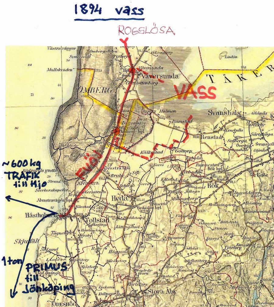 Ett grundvillkor var att den enda landtransport utom hästar/oxar och var var den smalspåriga Fågelsta - Vadstena - Ödeshögs Järnväg, visserligen för sin tid modern (bara 6 år gammal vid det här laget). På kartorna har jag försökt rita in de transporter som helt säkert / förmodligen gick på järnväg med heldragna linjer.