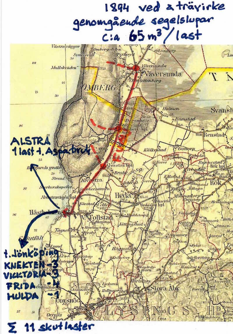 Vi tar en annan vara i dag också. Nu blir det ved och trävirke. Skogsprodukterna från trakterna söder om Ödeshög skeppades ut via Stava hamn / brygga, så man kan nog förutsätta att det som skeppades ut via Hästholmen kom från Omberg.