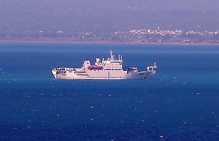Italienska kabelutläggaren Antonio Meucci IMO 8506062 kom in idag på middagen. Det finns en depå här för kabel. Det är en balkongbild så den är inte den allra bästa men vädret var klart så jag chansade. Använd förstoringen så blir den bättre.