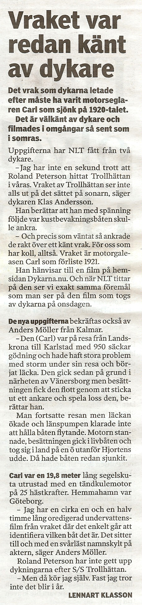 Klas, du skrev i tråden "skonaren Carl" i september förra året en del med anledning av att man hade dykt för att hitta "Trollhättan". Jag undrar vilken tidning och datum som artikeln "Vraket var redan känt av dykare" är ifrån. Vet du även vem som gjort historiken?