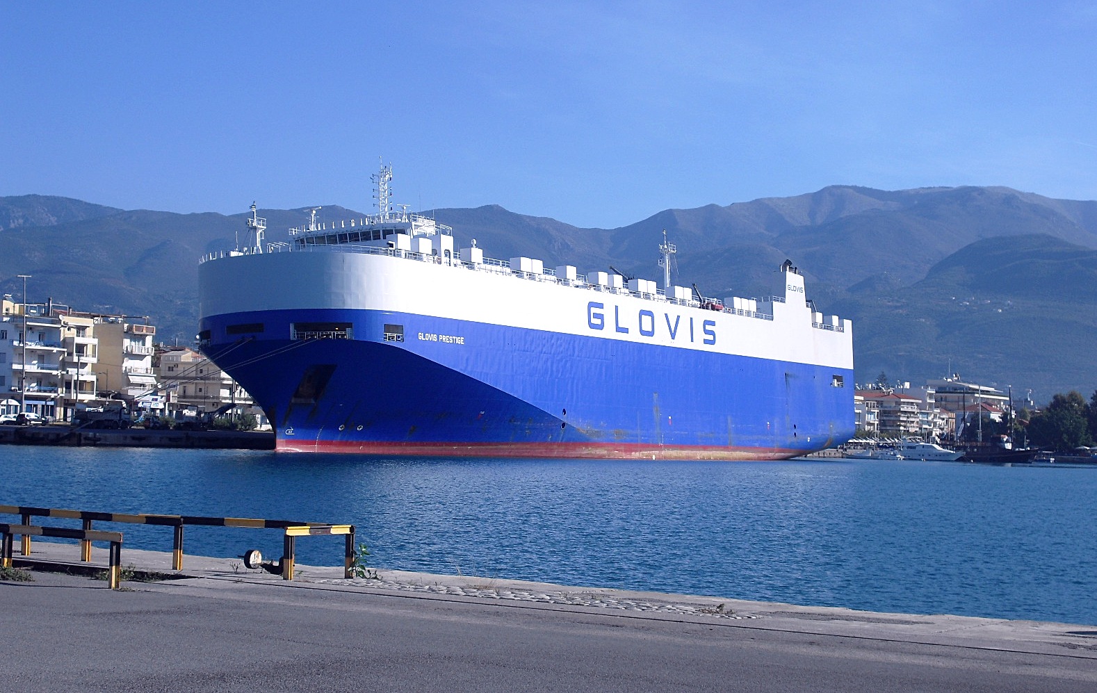 Glovis Prestige och Glovis Passion är inte oväntat precis lika stora. De är även byggda båda två 2011. Prestige höll på med en del ombordtagning av proviant och vatten när jag kom dit. Hon hade lite SB slagsida. SB sidport var öppen för spring ut och in. Dom kunde byta namnbrädor om det kniper, så lika är dom. Första gången det legat 2 bilbåtar här. Kan undra varför just Kalamata blivit populärt. Här kommer i alla fall ett par bilder.