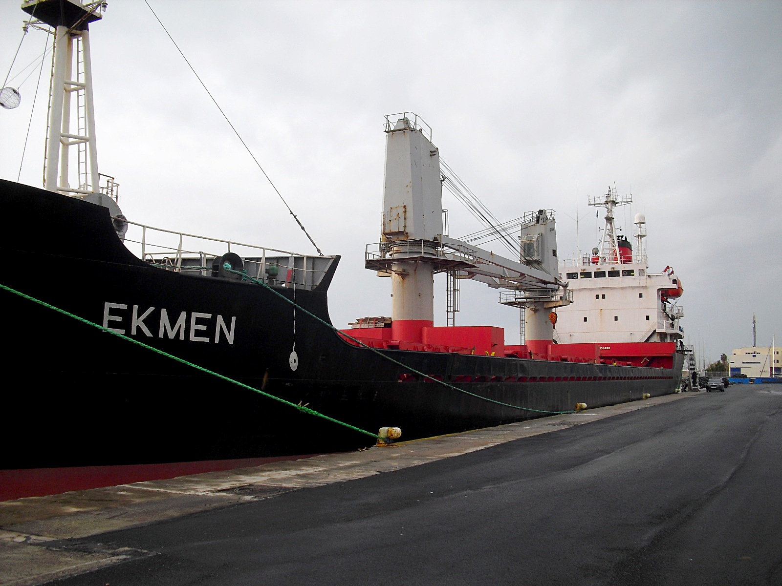 Ekmen IMO 9136888 har legat några dagar i hamnen efter att dessförinnan ha legat på redden i nästan en vecka. Hon är delvis lastad men jag vet inte varifrån hon kom. Hon skall till Aveiro i Portugal. Panamaflagg och byggd 1996 tar hon 6830 tdw. Det var inga aktiviteteter idag förutom en vakt vid landgången. Jag har heller inte sett att hon lastat eller lossat här.