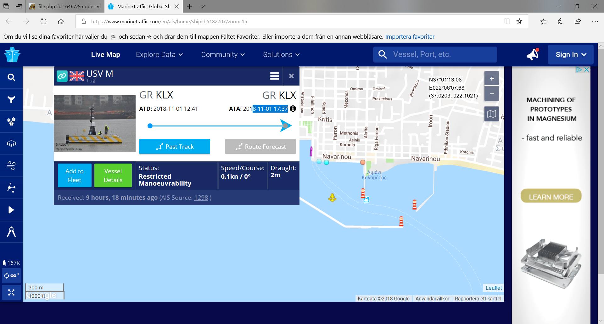 Det ser konstigt ut men det är den bild man får upp när man sätter pekaren på henne. Hon har varit ute under gårdagen och kört ca 15 distansminuter utefter vår sida av viken men var tillbaka på eftermiddagen i hamnen och ligger där nu. Prova att gå in på Marine Traffic och se på Kalamata så får du upp henne liggande bredvid Ledra Rride. Jag skickar med en bild på hur det ser ut i hamnen nu inatt. Den blå pricken är Ledra Pride, den ännu ljusare är den vi pratar om som på Marine Traffic heter USV M samt på tvärkajen ser man lyxkryssaren Sapphire.