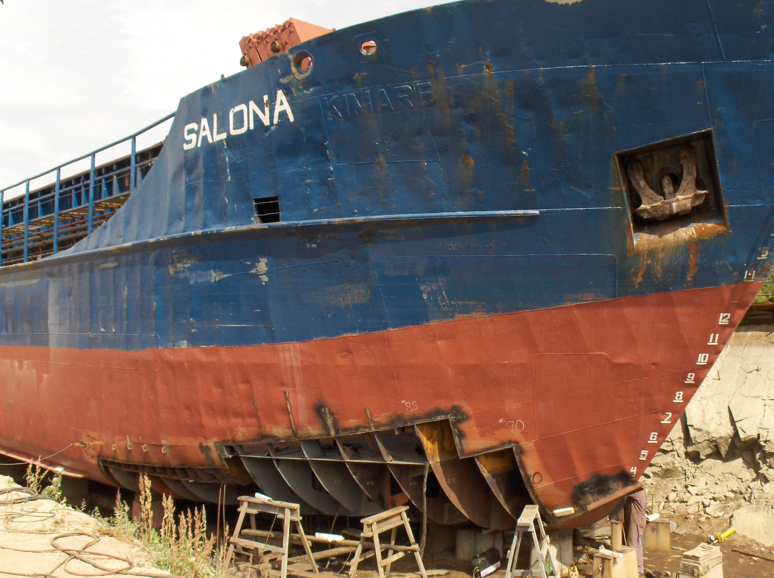 så syns det tydligt att fören är bortskuren och hål uppskurna i skrovet .