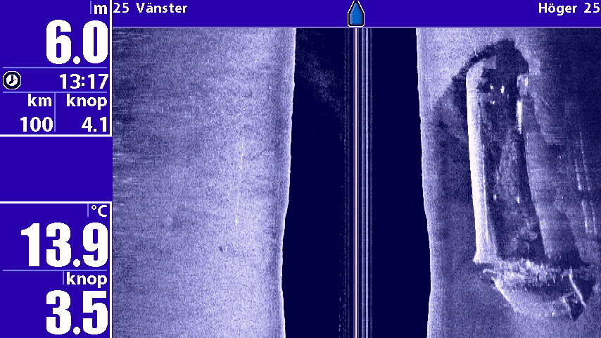 Lägger med några Side scan bilder på vraket idag , skrovet har sjunkit djupt i leran så det har bildats en djup grop där det ligger !