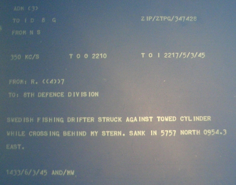 "5 mars 22.17 - Svensk drivgarnsfiskebåt slog emot en bogserad cylinder, när den (båten) passerade akter om min akter. Sjönk på pos N 57 57 - O 009 54.3."