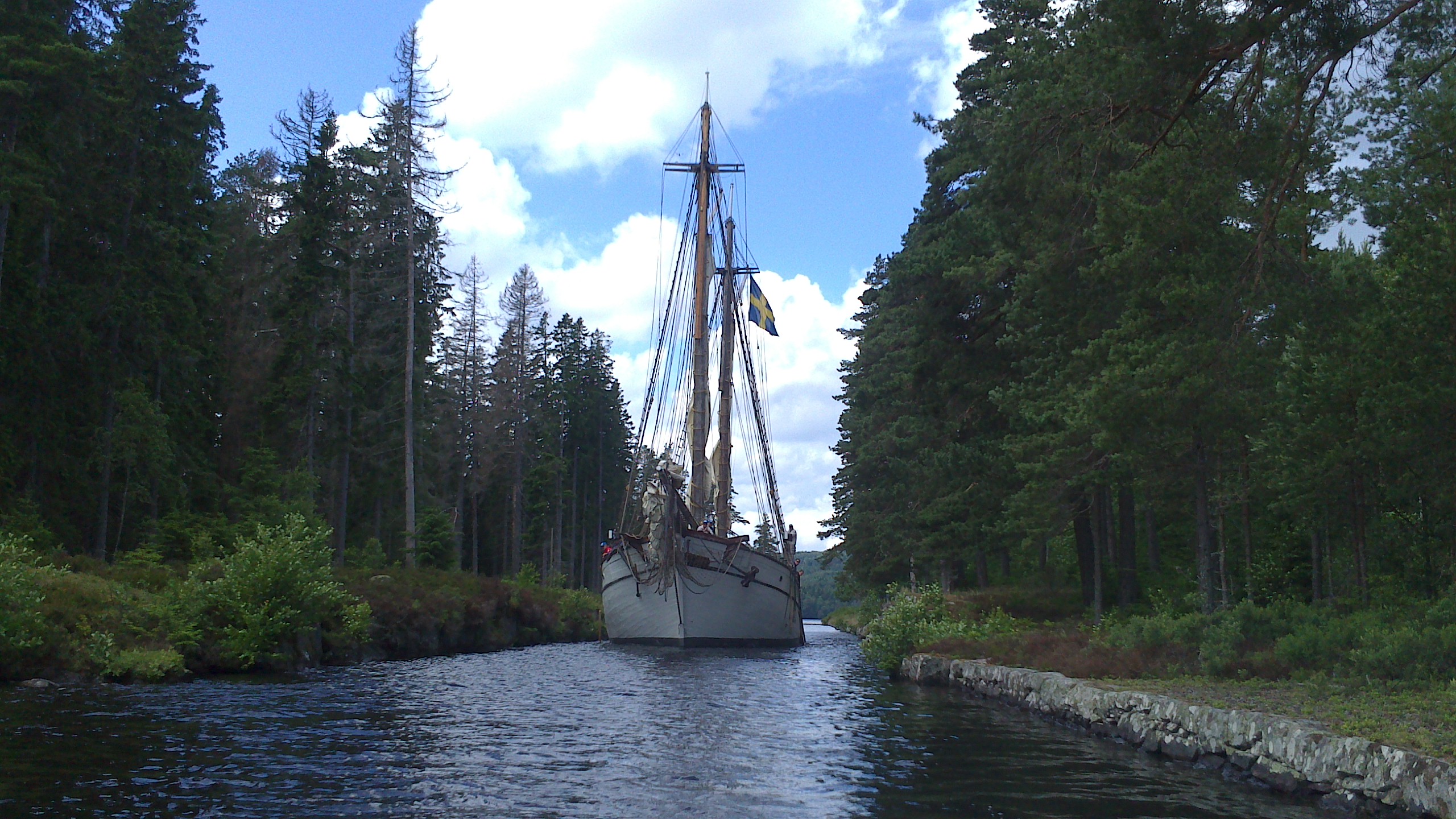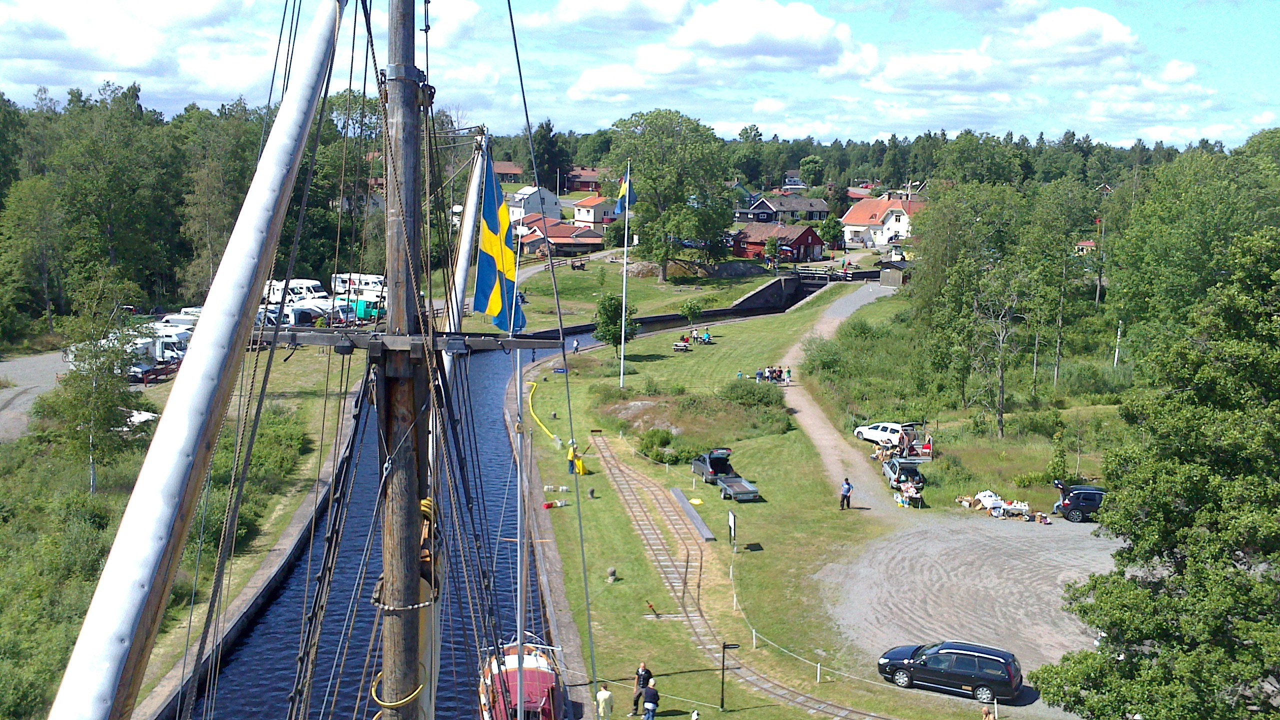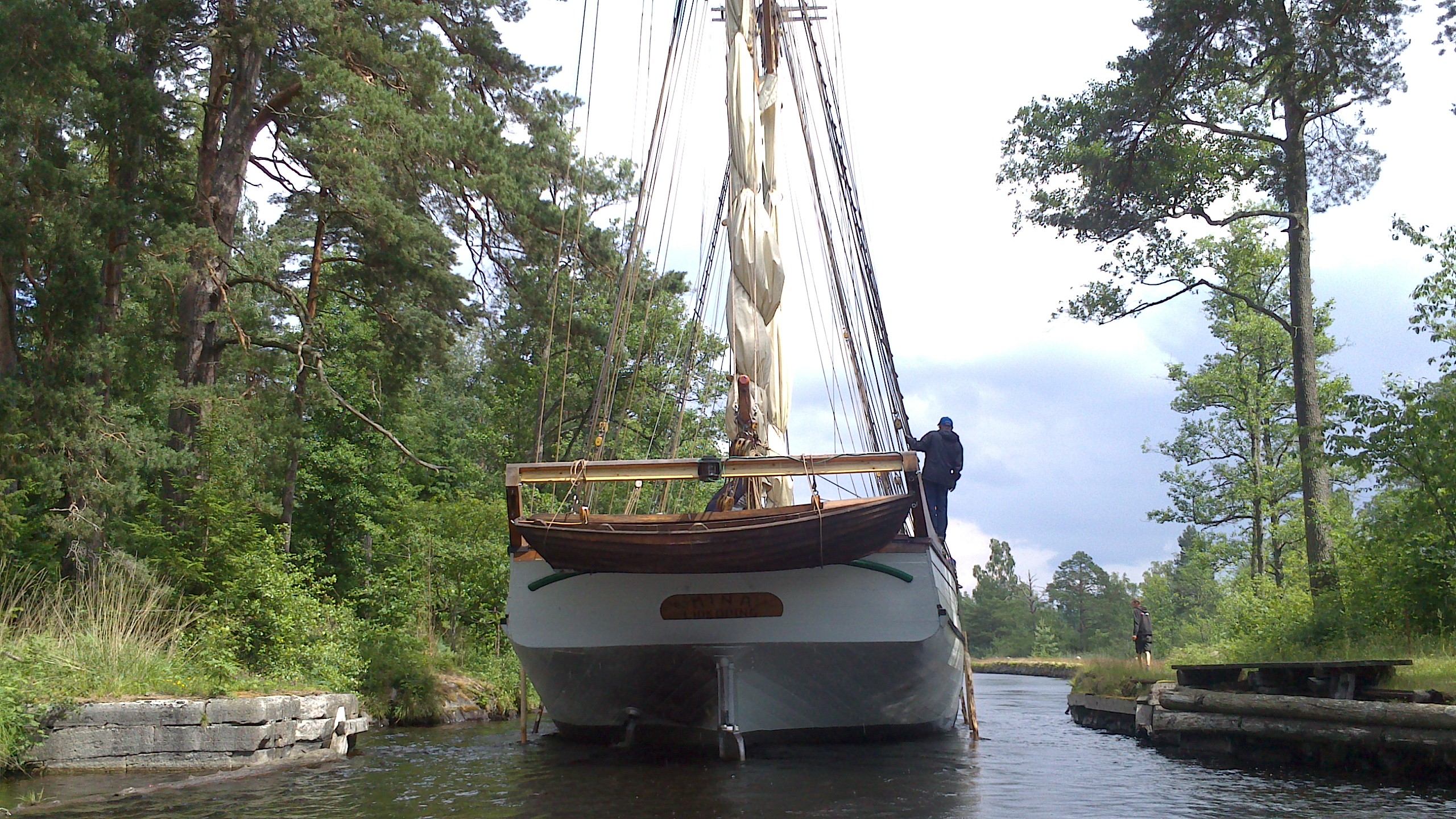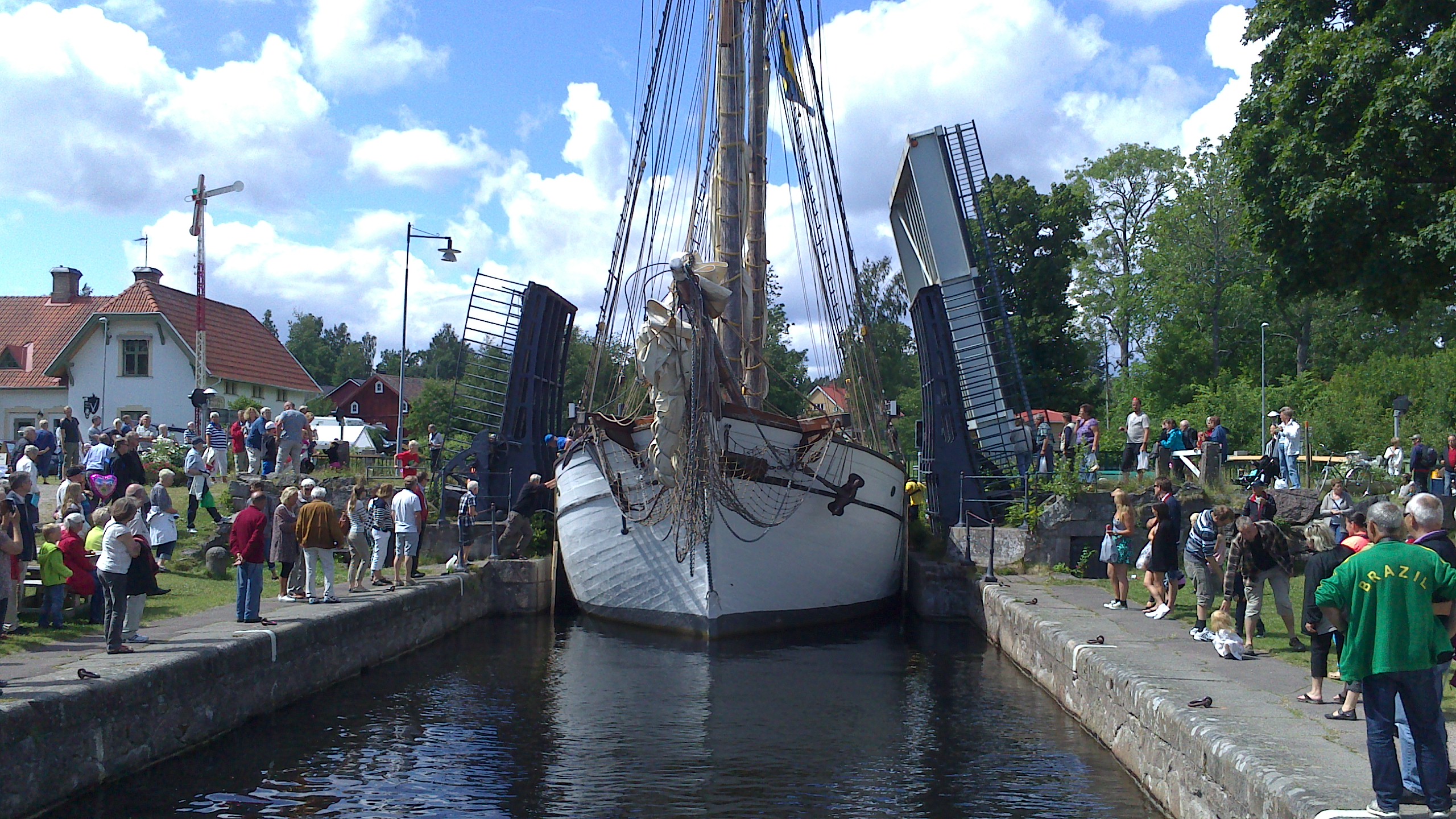 Mina kom glidandes på Viken in mot Forsvik och spetsnäset. jag mötte upp med gummit och lotsade genom Spetsnäset och Billströmmen. Väl in i den smala Forsviksslussen blev det stopp! Mina fick ta bort båda träna för att med någon cm tillgodo komma igenom brofundamentet. faktum är att minas bredd överstigen kanalens maxbredd!