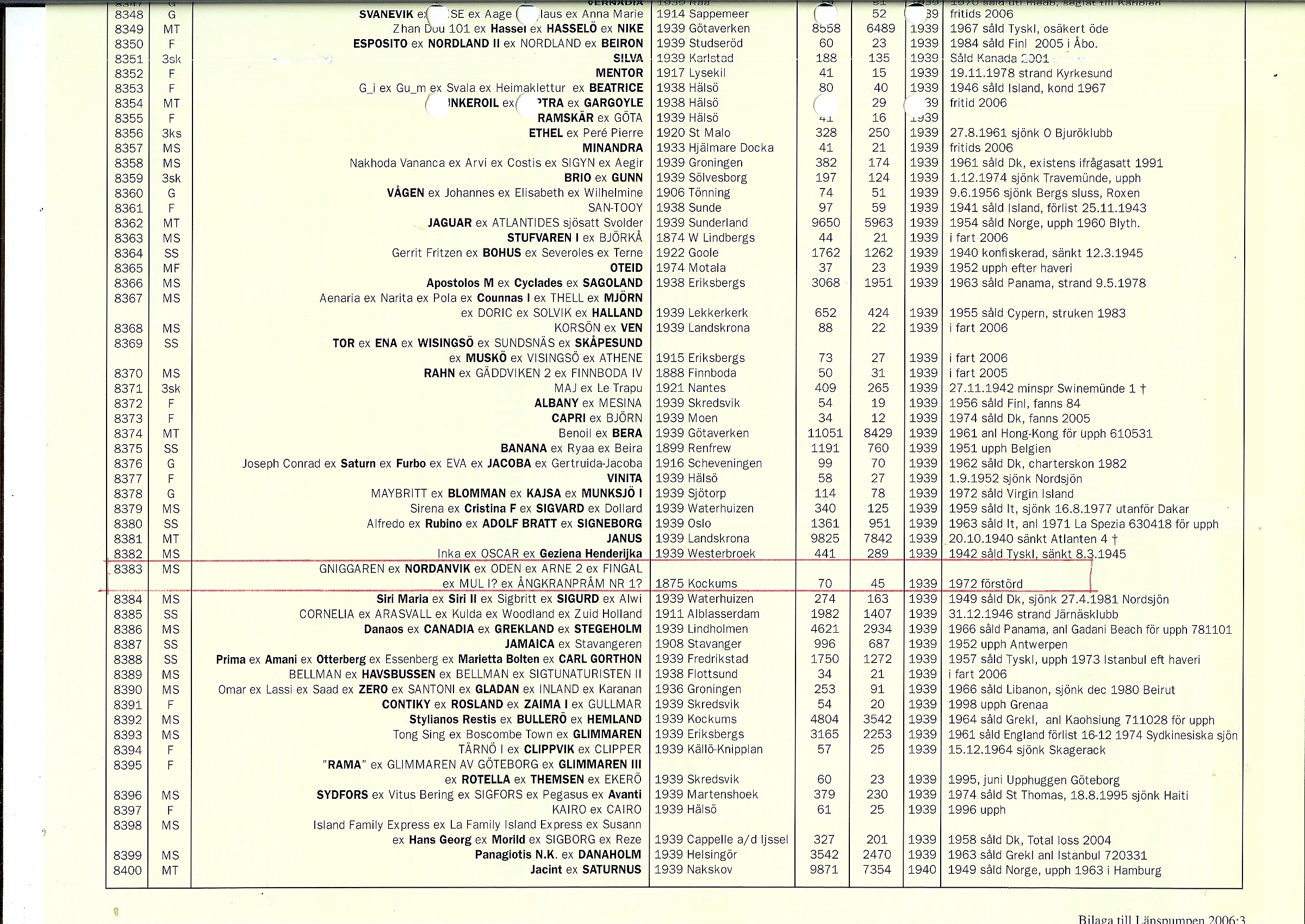 Tack för ditt inlägg Klas. Efter att ha varit pråm sedan 1923 anmäldes år 1940 att Nr 1 blivit m/s Oden med Skandiamotor på 65 hk (Tore Olsson). På Klas bilder ser man ingen lastlucka. 8383 blev registrerad 1939 och det bör då ha varit pråmfartyget Oden som blev registrerad om uppgifterna stämmer. Men redan året efter fick hon cert som m/s Oden med motor. Jag skulle gissa att i ansökan om registrering 1939 står när och var hon var byggd.