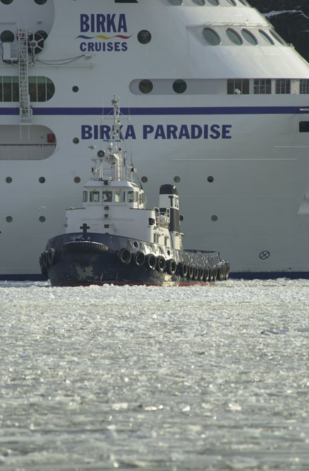 Birka Paradise har kört sönder bogpropellern i isen och knuffas in av Tug.