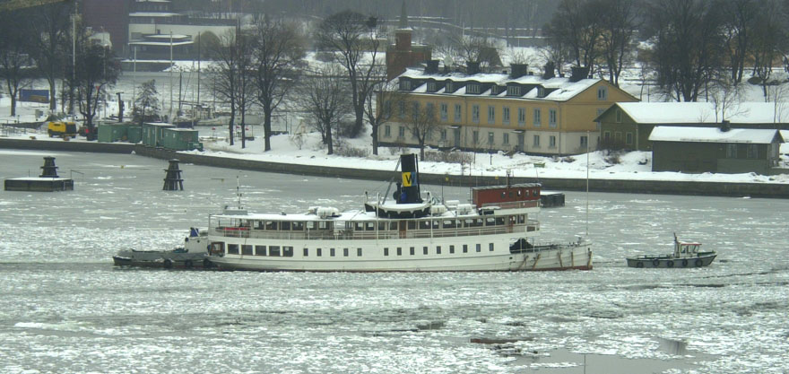Här är Norrskär på väg till varv. Det var tänkt att Pampas marinas bogserbåt Titan skulle bogserat men hon körde fast i isen under Tranebergsbron. Hamnens båtar fick rycka in.