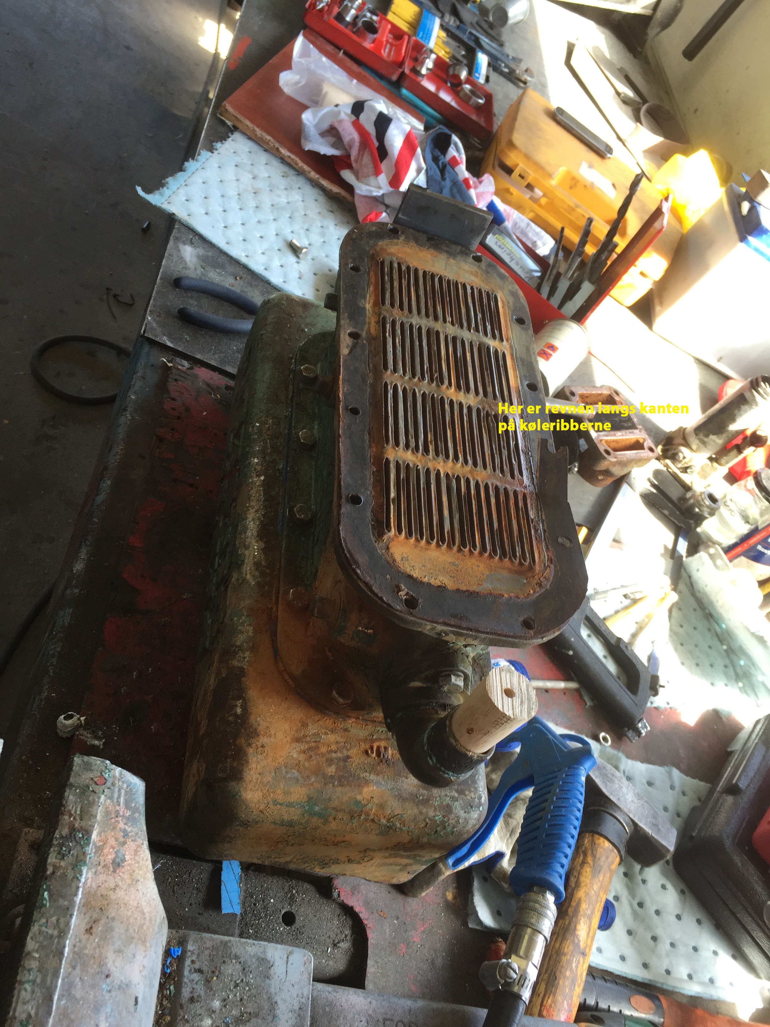 Min har generator på venstre side og har køletank foran som sidder ovenpå varmeveksleren. PÅ vandtangen sidder der også en stor aluminiumsklods hvor der sidder to termostater som forbinder vandtanken med det firkantede rør hvor udstødningen også går ud.