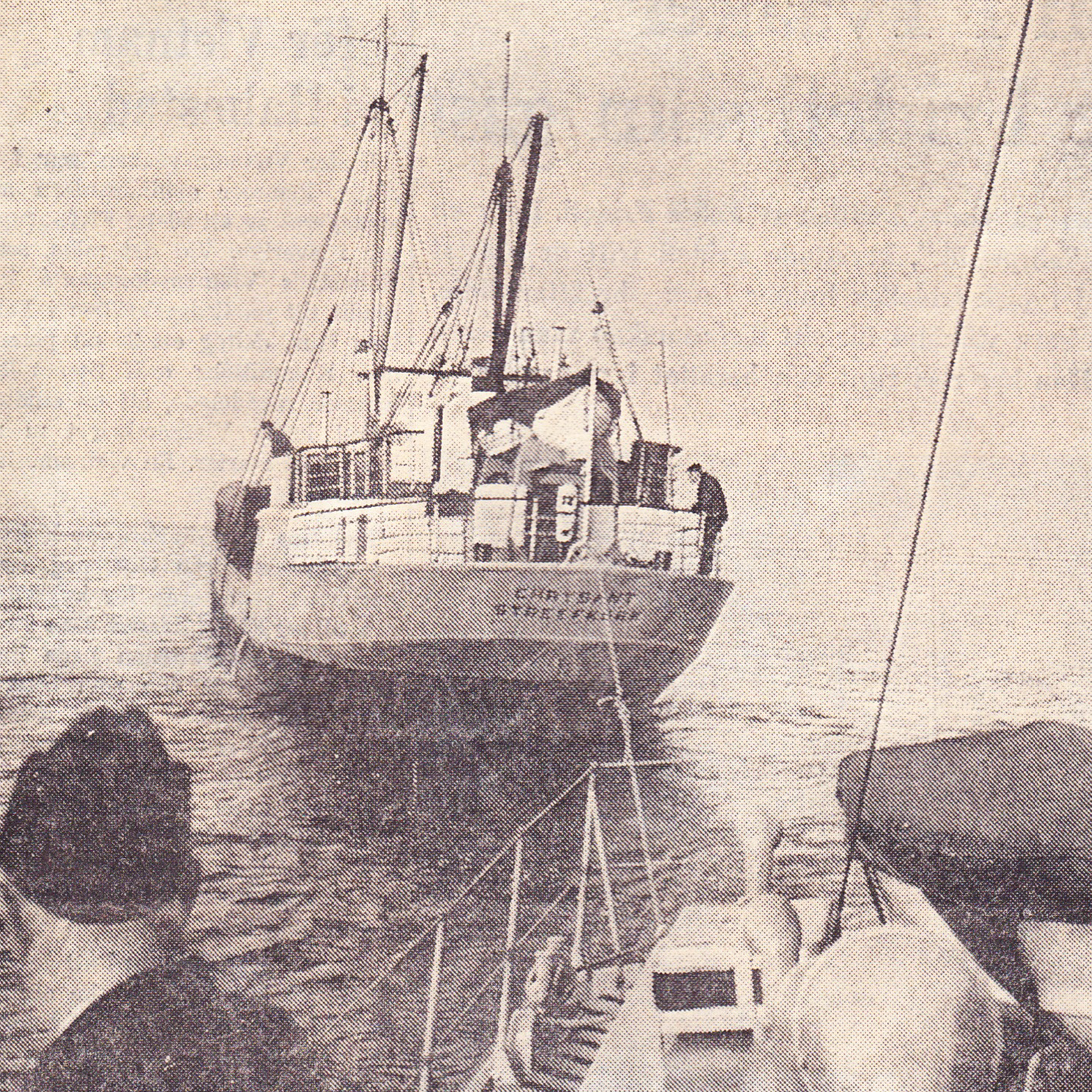 I det läget köper den legendariske Alvar Olsson henne, åker ut med ett par båtar, slänger över en tross och drar in henne till Varberg utan att vare sej lossa någon last, eller täta några läckor... hm, den mannen kunde göra affärer...