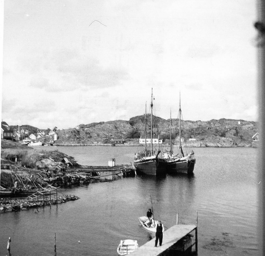 Två galeaser liggande vid bryggan till slipen på Härön utanför Kyrkesund, i slutet av 40-talet tror jag eller möjligen i början av 50-talet. Det fanns ju några båtar vid den tiden i Kyrkesund men det hände även att man kom från andra trakter och tog på land. Det är svårt att säga vilka det är men omöjligt är det nog inte. Vem vågar försöka?