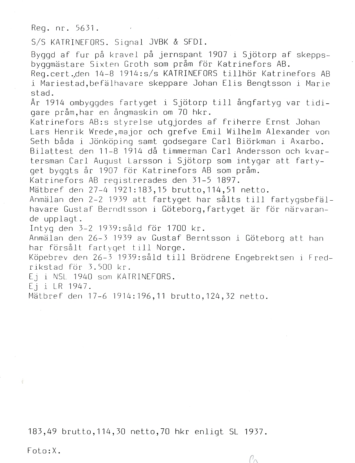 Visst är det Katrinefors.Torsten H wrote:Beträffande ångbåten, så tror jag, att jag kan läsa NEFORS, och då skulle de vara 5631 KATRINEFORS.