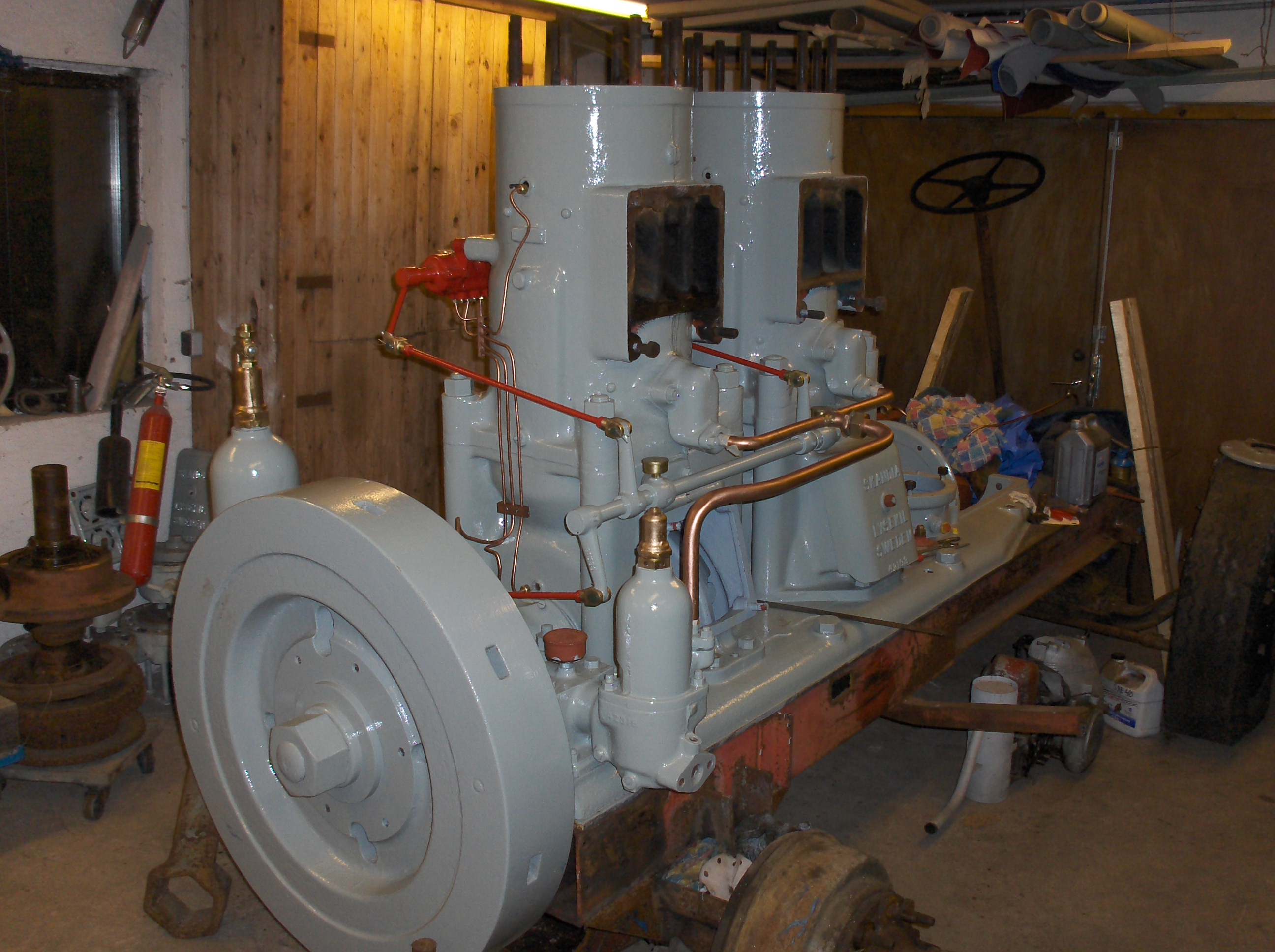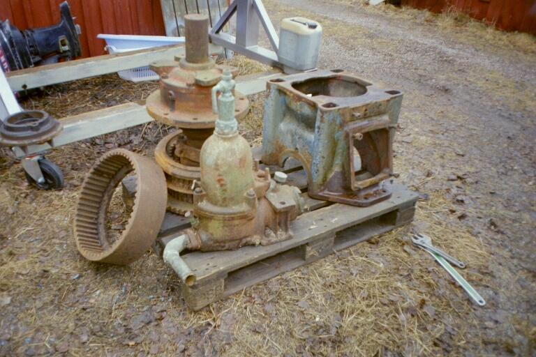 men när den var nära startklar så kroknade han av nån anledning ...,när sen frun några år senare ville ha en garageplats så var problemet att där stod 6 ton motor ! gratis om vi hämtade den ! den var komplett med koppling ,avgasrör ,mm