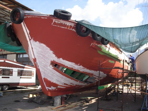 Dags att rapportera hur det går båtreparationerna nere vid varvet i marinan. Det har gått ganska lång tid sedan jag var där, bl.a har jag varit i Sverige i 5 veckor. Men idag var jag nere och tittade och fick även lite knapphändig information. Som ni ser så har det gått framåt och stora delar av förskeppet under vattenlinjen har blivit utbytt. Man har tagit bort den kraftiga avbärarlisten på en del ställen och man har kommit igång med akterspegeln. Jag såg bomullsgarn hängande i fogarna mellan borden och frågade om detta. Det är bara bomull som duger fick jag till svar. Det verkar som man bottnar med bomull och därefter fyller ut med nåt modernare. Över de färdiga delarna stryker man rikligt med grundfärg. Det jag såg idag såg bra ut. Undrar just om man skall föra i ordning däcket också? Vi får se.