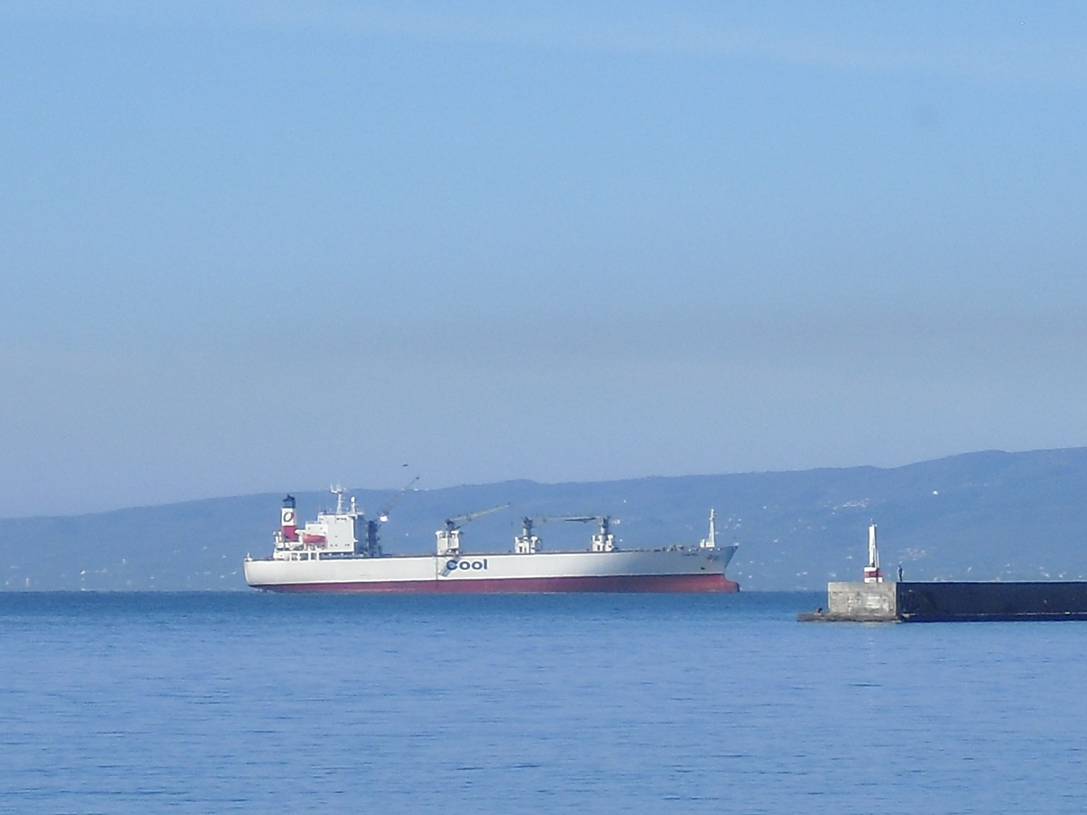 Idag på morgonen var det 2 fartyg på gång framför balkongen. Det var Chaiten IMO 6423369 som redan låg för ankar ute på redden. I kikaren kunde jag läsa COOL på fartygssidan, och det visade sig vara ett kylfartyg på lätten som kommit in och ankrat upp. Liberiaflagg.