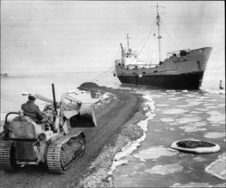 Jag hittade ett foto på coastern Tutte Kjep på 245 ton dw, som i februari 1964 gick på grund utanför hamnen och fick grävas loss.