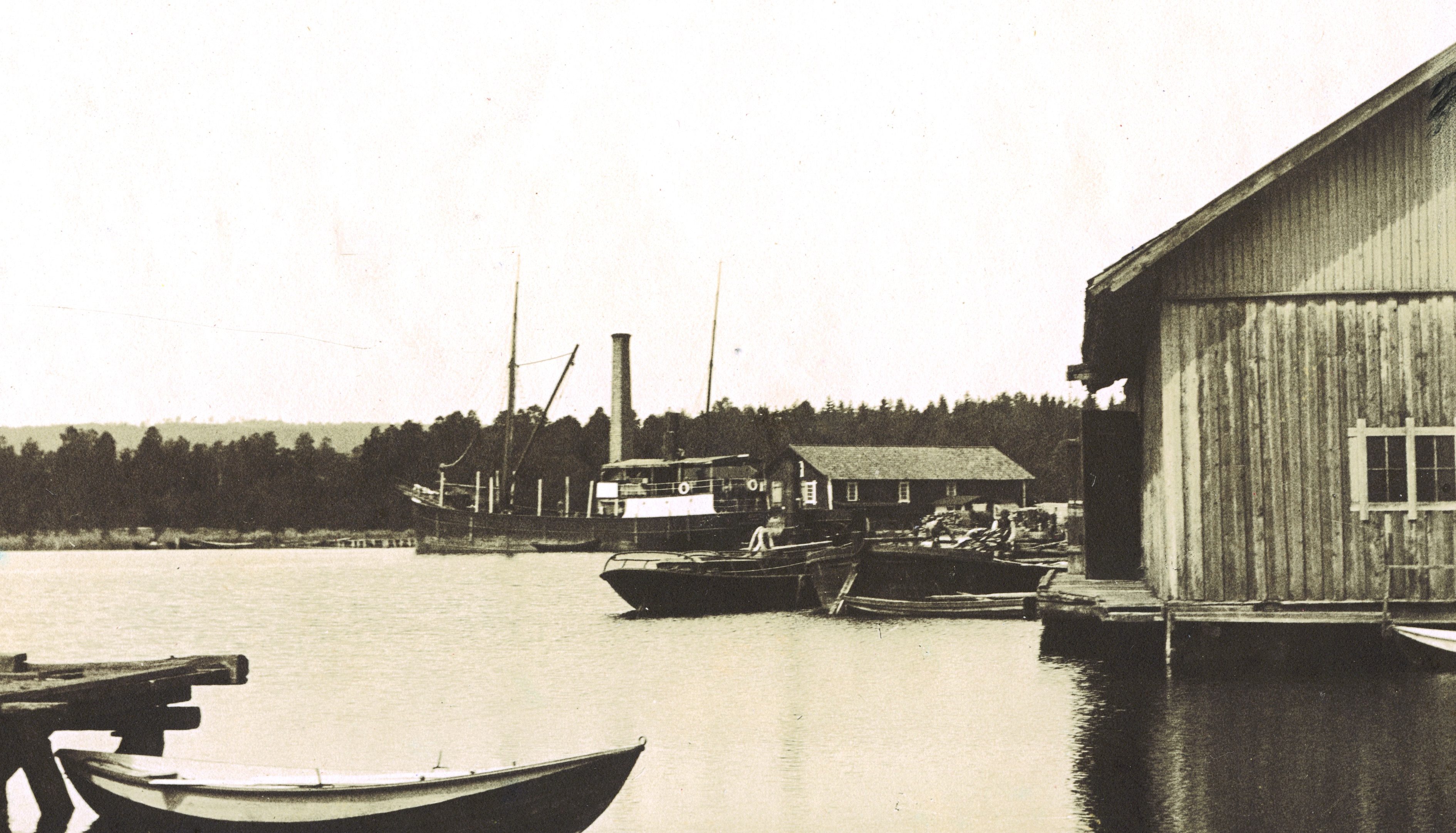 Forsvik sågen sett från Spikbryggan. lastbåt vid sågen lastar virke och sågens timmerbogserare vid bryggan.