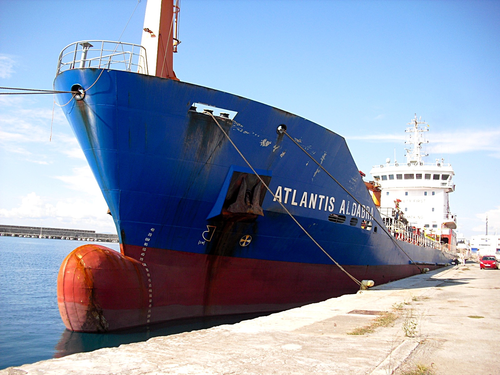 Här kommer bilderna på Atlantis Aldabra som irrat omkring i Messinian Bay och längre söderut. Hon ligger i hamnen nu och jag hade ärenden i stan som också tog mig förbi hamnen. Vad jag särskilt lade märke till var en samling galonprydda poliser som äntrade landgången med diverse apparater och började samtala med besättningen. En del ur besättningen hade munskydd på sig när de klev omkring på däcket. En polis med galoner, tillsammans med en civilklädd person, fotograferade bulben i fören på nära håll. Hon sticker där hon ligger 2 meter akterut och något mindre förut. För mig verkar det som det hänt något. Men det var inga särskilda restriktioner i hamnen. Jag tog mig in den vanliga vägen och promenerade längs fartygssidan. Något förslag till vad som hänt henne? Imo finns på bilden.