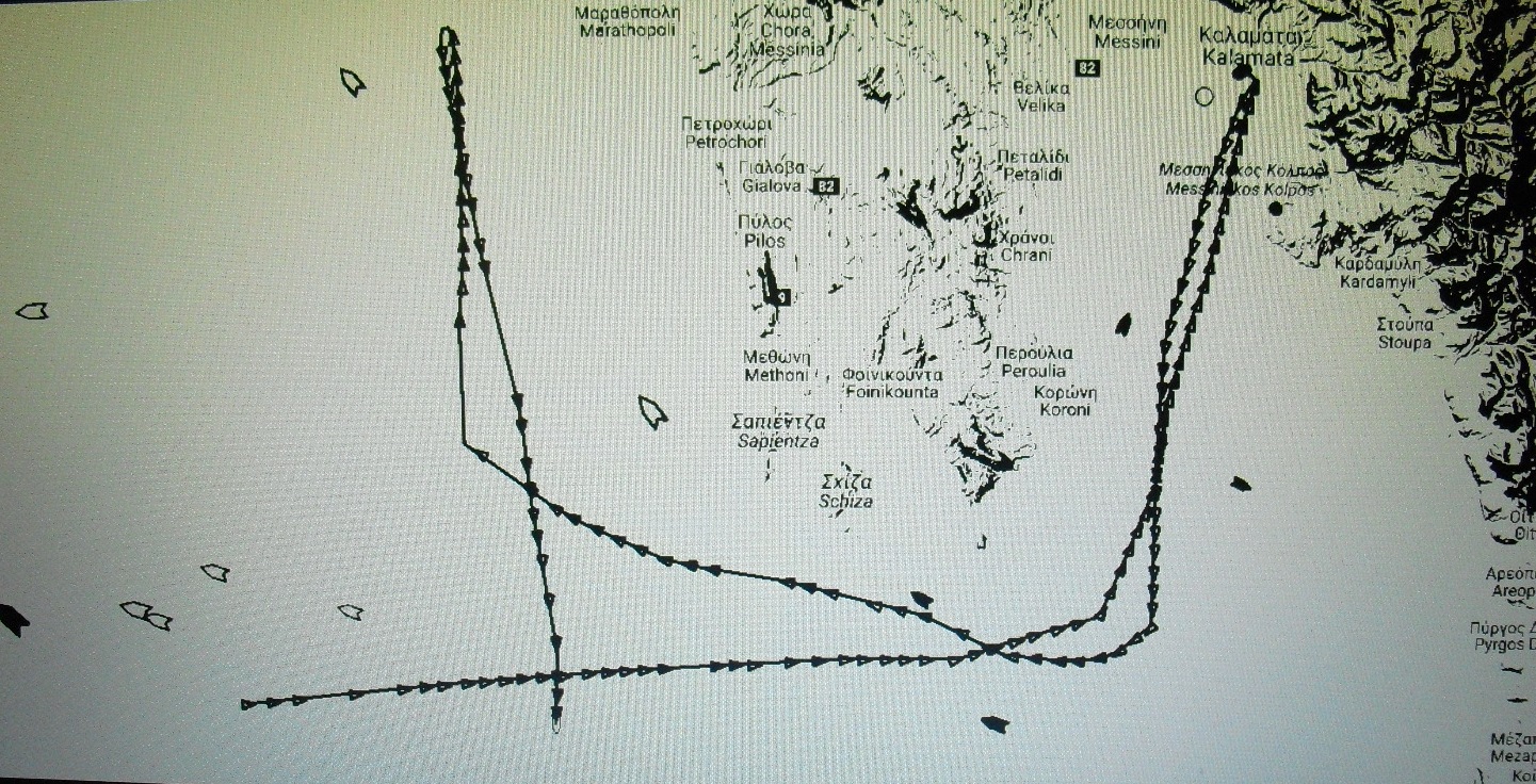 Kemikalietankern Atlantis Aldabra som låg ankrad vid Koroni har kört omkring i Yttre Messinian Bay och även längre söder ut i knappt styrfart men har nu ankrat upp vid Kithiras sydliga udde istället.