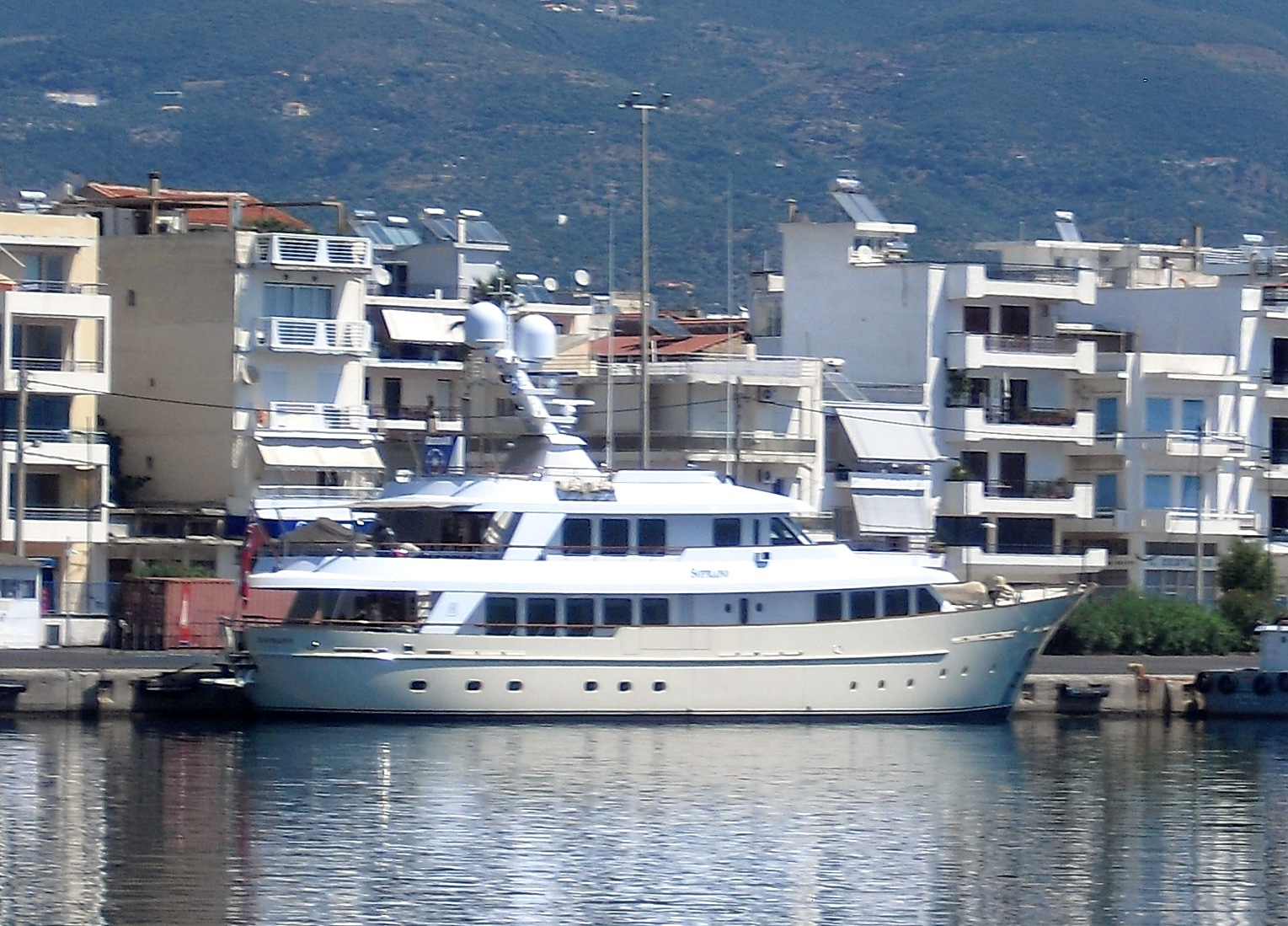 Den här är 38 meter lång och heter Soprano IMO 1013133 med flagg från Cayman Isl. Av 5 bilder idag blev den bästa med båten i högra hörnet. Detta är näst bästa och inte alldeles klar. Det står inte när hon är byggd men eftersom hon ser ut som en båt så kan hon ha några år på nacken. Någon som vet?