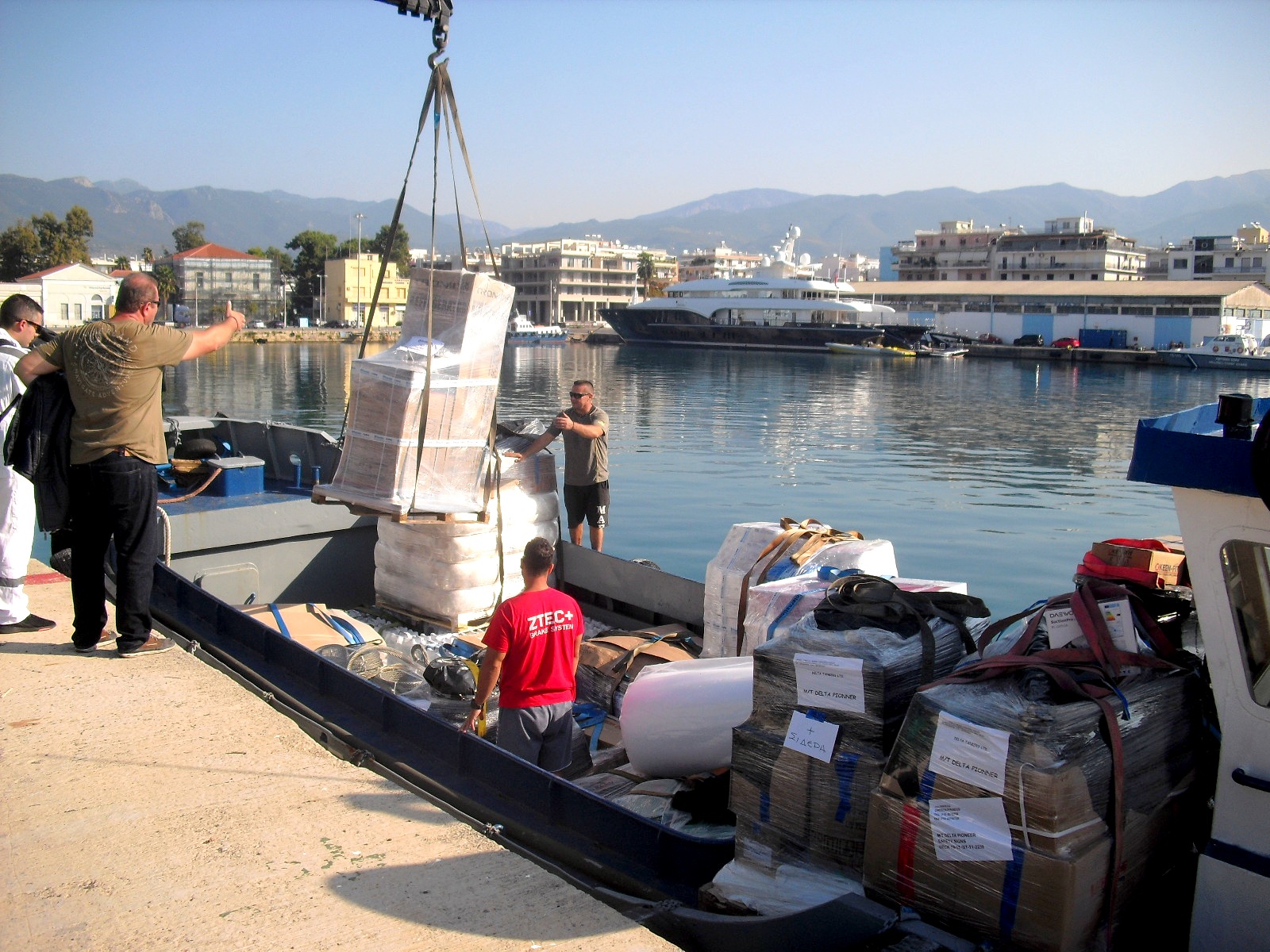 Proviantering för Delta Pioneer idag på förmiddagen. En styrman från båten och en rederitjänsteman övervakade det hela. Kalamata ligger bra till för trafik i Östra Medelhavet (enligt styrman).