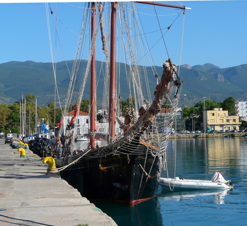 Det verkar stämma ganska bra. Den nuvarande ägaren hade hittat den sjunken i Turkiet för en massa år sedan, 30-40. Det är samma ägare sedan dess, engelsmän. Hon gick härifrån dagen efter mot Pilos. Masterna är av järn men annars är det mest gammalt trä.