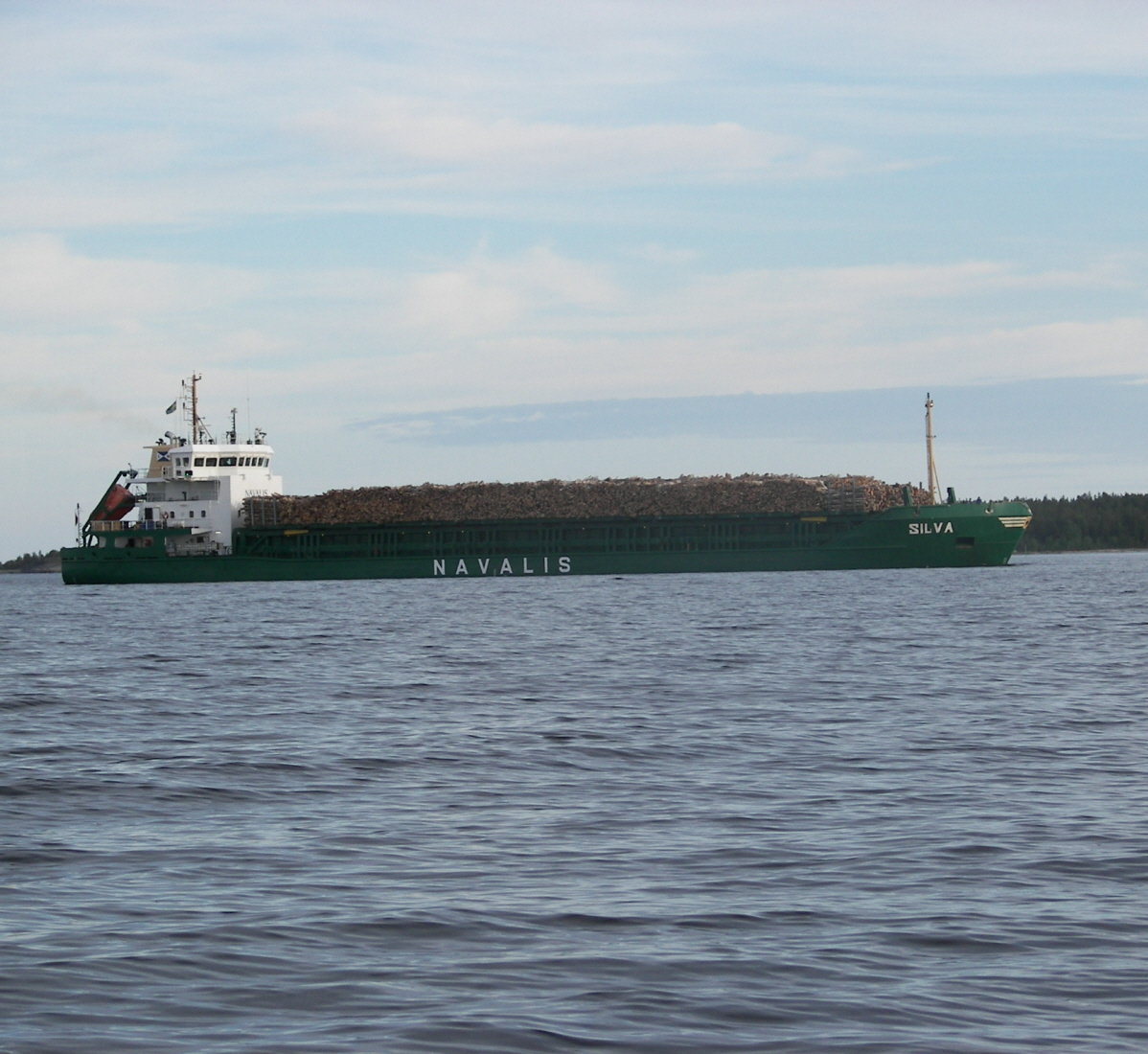 Den här bilden hittade jag nu när jag sitter och bläddrar i mina album. Kortet tog jag 1996. Antingen regnade det så jag sökte skydd i skogen eller också beror inramningen med trädstammar på något anfall av konstnärlig hybris. Kan det vara M/S Sydfart?