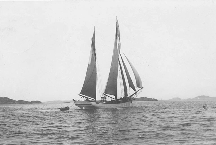Jag har fått veta, att galeasen är SALUS, regnr 502, byggd 1889 i Lillesand, Norge, 50 brt, såld 1893 till partrederi i Mörrum, 1894 till Gullholmen, 1899 till Fiskebäckskil, 1907 till Gåsö, 1912 till Fiskebäckskil igen, 1924 rapporterad upphuggen där.
