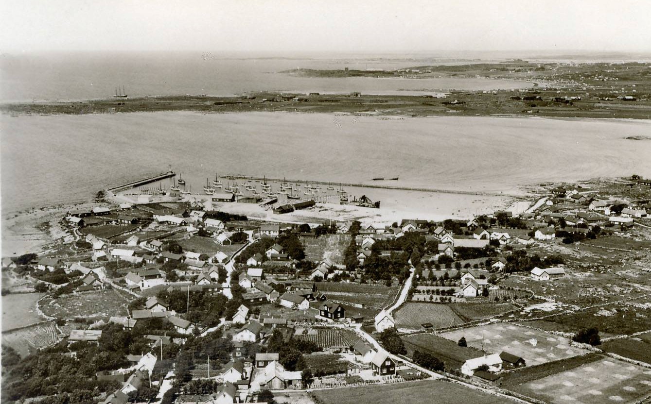 Flygfoto över Träslövsläge. Bortom Södra Näs skymtar den strandade Beatrice.