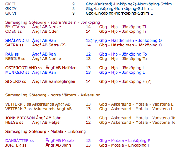 Det krävdes således 18 ångare för det rena lastlinjetrafiken. Det fanns andra flitiga gäster, som BJÖRN som gick varannan vecka till vätterhamnar, samt HILMER och ELLEN som tycks ha samseglat torsdagar från Göteborg.