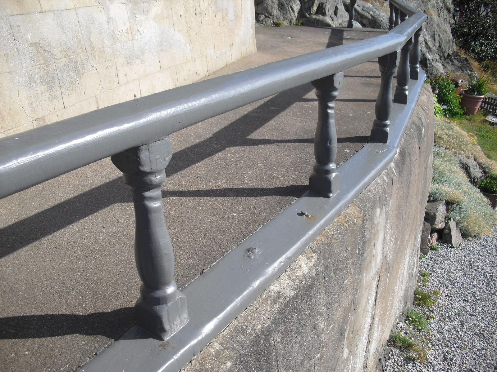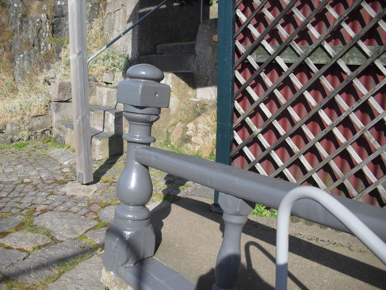 Här kommer bilder på räcket på akterdäck som sattes upp vid huset hos Oskar Nilsson som tillsammans med sin bror Alfred Nilsson skrotade barken Nordenskjöld i Skärhamn 1909. Bilderna tog jag helt nyligen. På en av bilderna finns en stötta som är betydligt högre medan de andra är av lägre modell. På en av bilderna tycker jag mig kunna se slitage från tågvirke på två av stöttorna. Jag kommer ihåg att färgen var vit tidigare och det säger husets nuvarande ägare att de varit så långt han minns.