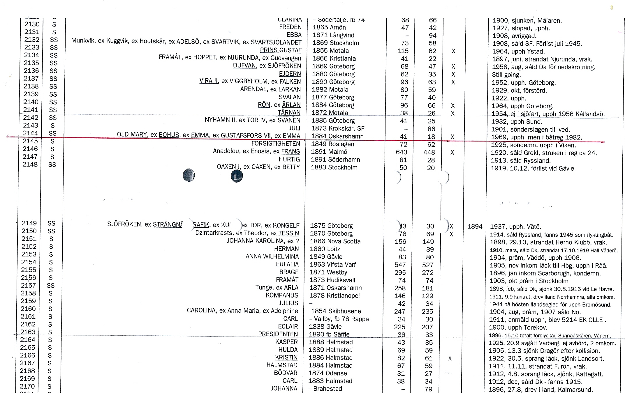 Emma anmäldes 1969 som skrotad och avfördes samma år som upphuggen. Det förekommer dock uppgifter i Båtologen 1985 att hon existerade som L/F Bohus och att hon fanns med det namnet i skeppslistan 1987 i Göteborg. I Båtologen 1991 finns även uppgift om att hon skulle finnas med namnet Old Mary i Karlskrona. Mättal SL 1969: 37/19 med 40 hk motor. Namnnyckel: Old Mary ex Bohus ex Emma ex Gustavsfors VII ex Emma.