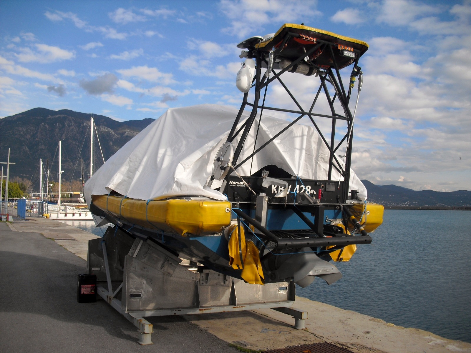 Ytterligare en av KBV:s båtar i Kalamata men den har varit här hela tiden som KBV 241 varit stationerad här. Ibland har den stått på kajen och ibland har den stått i vagga på KBV 241:s däck. Nu står den i vagga på kajen medan KBV 241 är ute och patrullerar. Hon gick ut för ett par dagar sedan och brukar vara ute ca 5 dagar åt gången. De kommer att återvända till Sverige i april. Hur det blir med patrulleringen därefter viste inte den jag talade med för en vecka sedan. (kanske hemligt) De som jobbar ombord får avlösning med jämna mellanrum. En som jag talade med skulle hem nu och vara tillbaka för återfärden till Sverige i april. De är 10 man ombord. Mycket är då automatiserat i maskin.